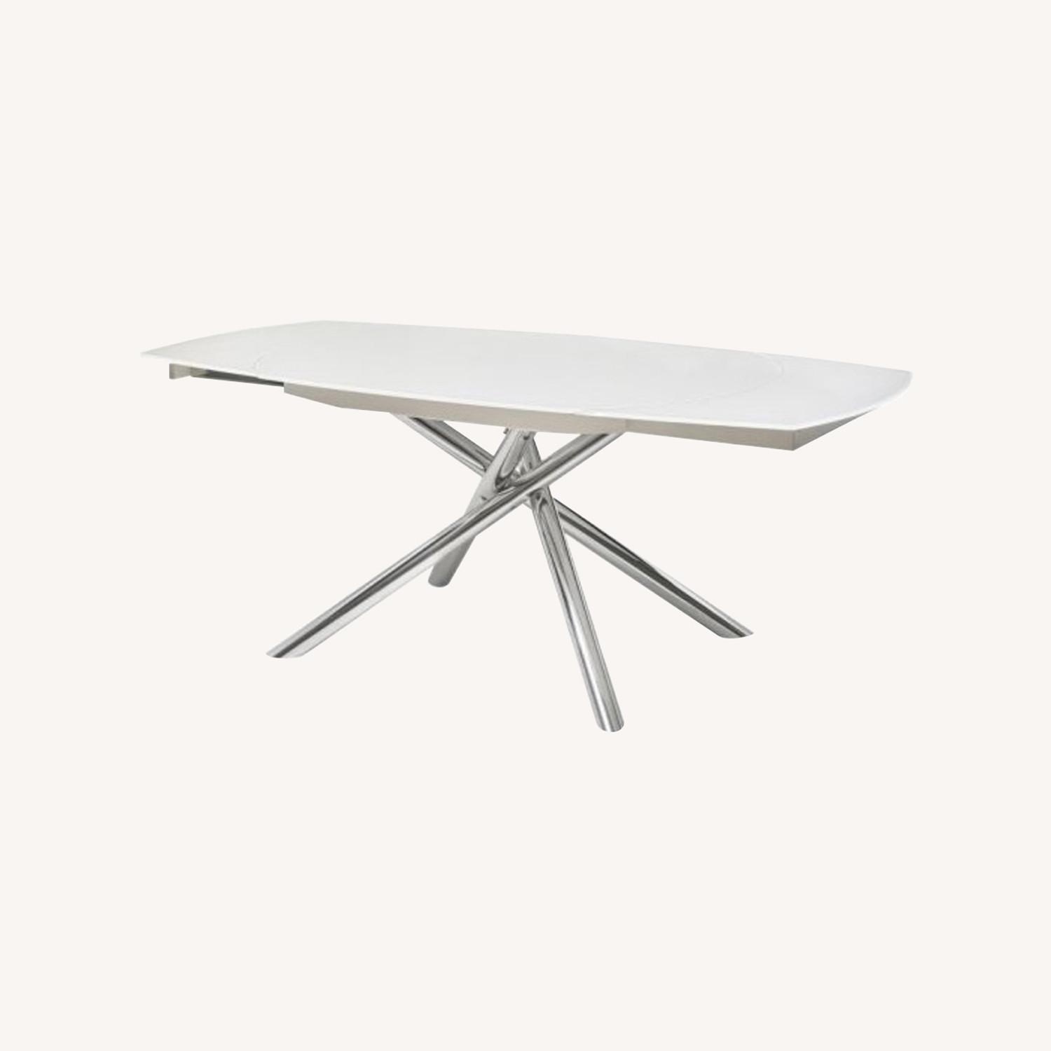 The Astro Extendable Dining Table in White elevates any space with the simplicity of its white tempered glass and elegant crisscross metal legs. This table features an extendable top to expand or contract to fit to the desired size. Changing up the size and look of your dining area is easy with this dynamic design.
