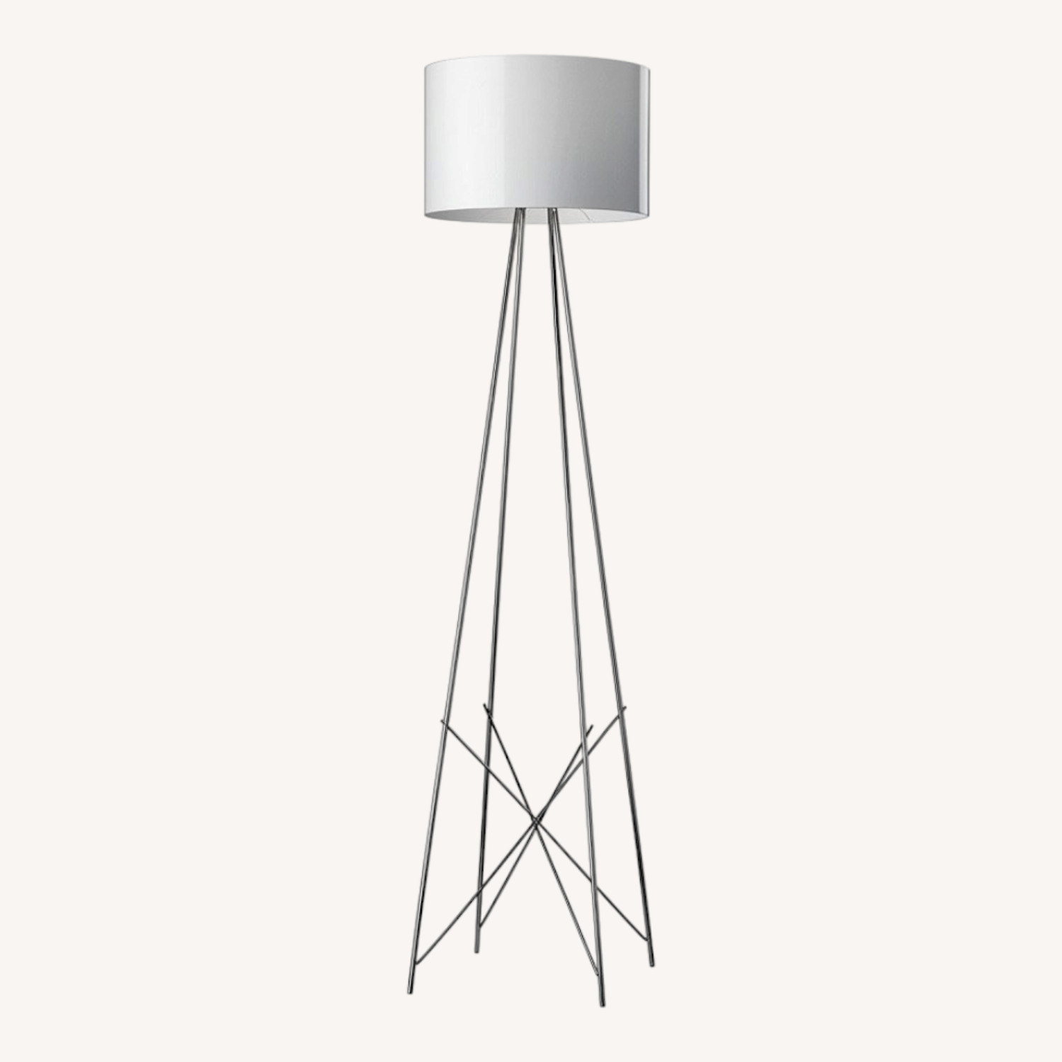 Seller's Notes:Designed by Rodolfo Dordoni in 2006, the Ray F floor lamp updates a classic shape to give it a decidedly contemporary edge. The steel tube structure of this modern floor lamp is welded, brushed, and chrome-plated, and its diffuser support disk is die-cast, polished, and chrome-plated with Zamak alloy. The lamp has a resistive dimmer wired on the cord, offering a 0-100% lighting adjustment. The power cord is a black PVC/PVC (flat) sheath. Inspiration behind the Design: Offering a fresh perspective on an iconic shape, Rudolfo Dordoni designed his modern drum diffuser to resemble a lighthouse. "The stand that supports the light source is an elementary structure," he says. "It is part lighthouse, part power pylon." Note: This lamp ships with an halogen bulb and it is compatible with LED bulbs. The Ray F is available in two models with diffusers available in black or white aluminum, or grey glass. It emits a gorgeous, diffused light. With the black and white finish, diffusers are lathe-shaped aluminum and painted white on the inside. The grey glass diffuser is hand-blown, overlaid glass with a glossy external finish.