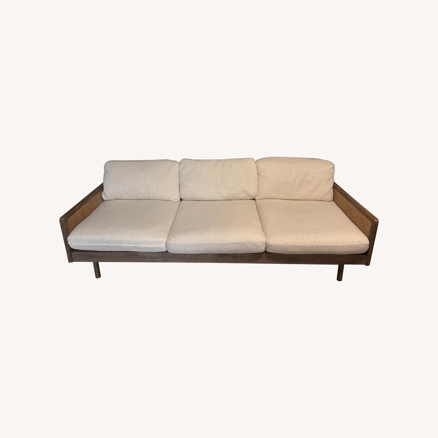 Scandinavian inspiration at its finest. Solid parawood framing features side panels of natural cane, for a textural and trend-forward material mix, with creamy taupe high-performance upholstery and feather-blend cushioning for unmatched comfort.