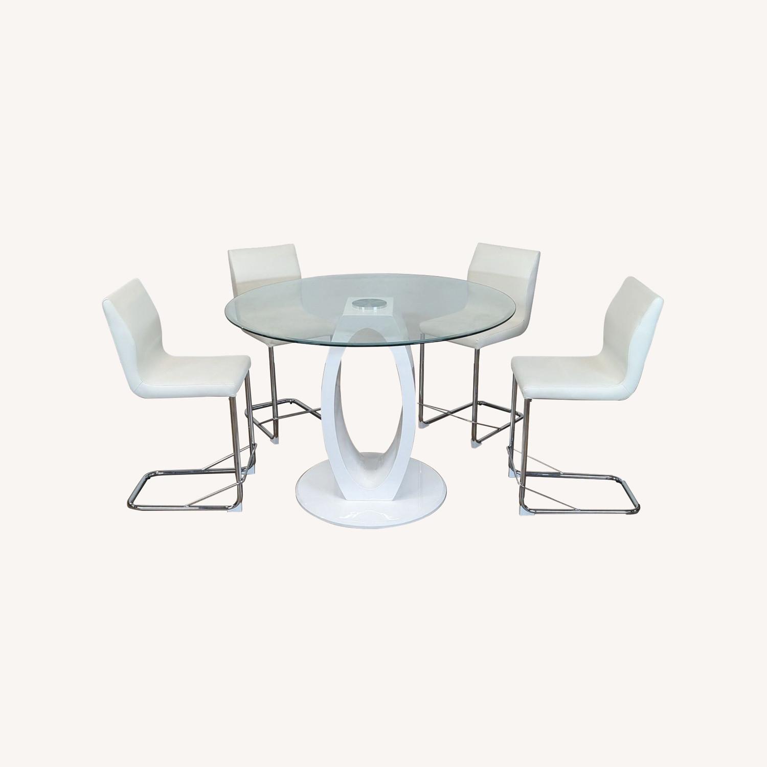 Seller's Notes:This eye catching modern pub table features a cool white lacquer finish, balanced out with a round glass top and pedestal base. Included are four leatherette chairs with chrome legs.