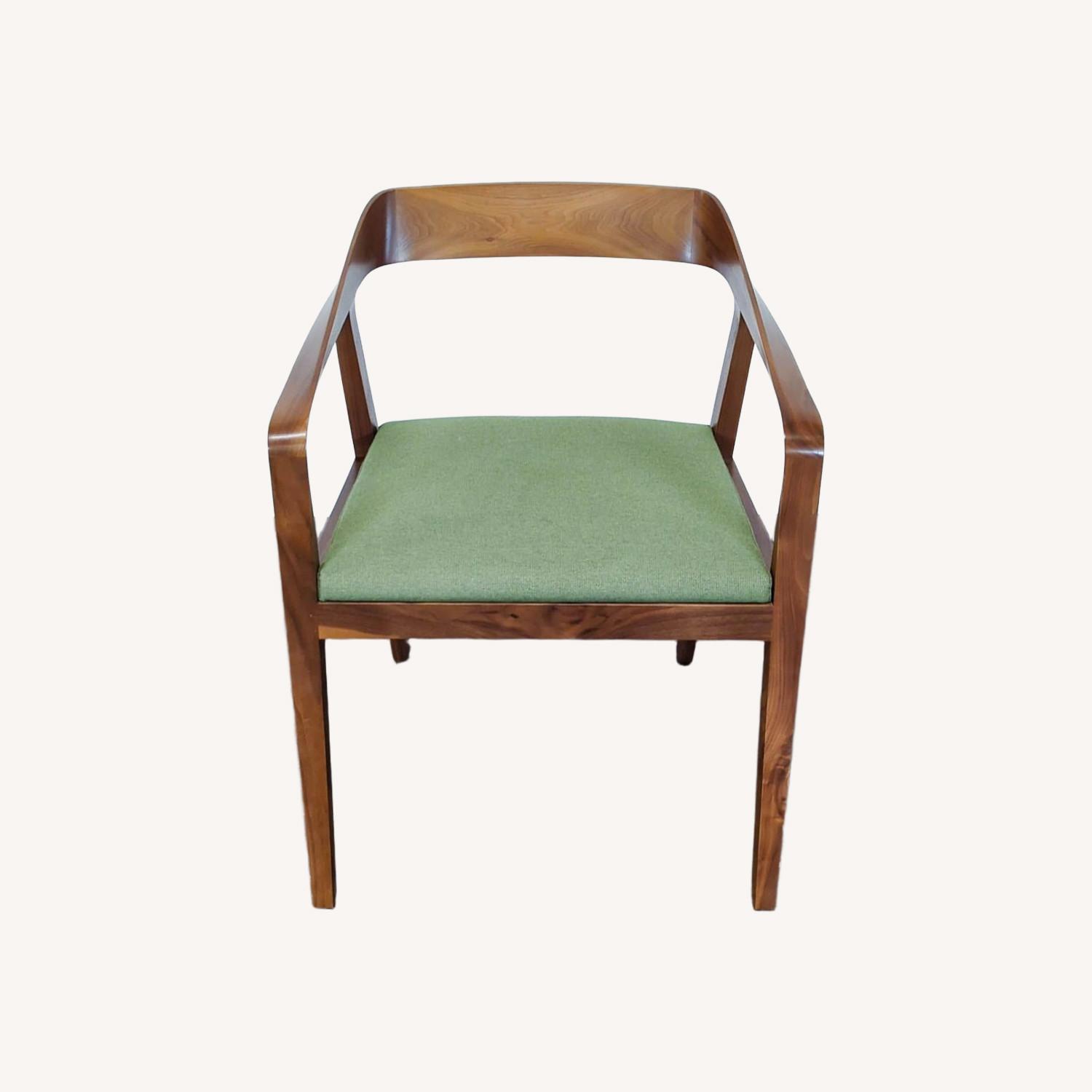 Seller's Notes:This stylish chair features a smooth walnut wood frame and a comfortable green cushioned seat. Its curved backrest and arm design provide both support and a modern look. Perfect for dining rooms, offices, or living spaces.