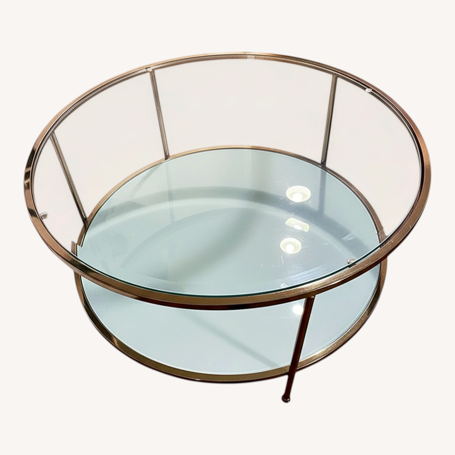 Seller's Notes:Top is 33.5" wide, bottom is 32.25" wide. Round, clear and opaque coffee table. It's lovely, just doesn't fit in my new apt. There are some superficial scratches that are hard to photograph. They're not overly obvious, just from normal wear and tear. Top can pop off so it's easy to move around.