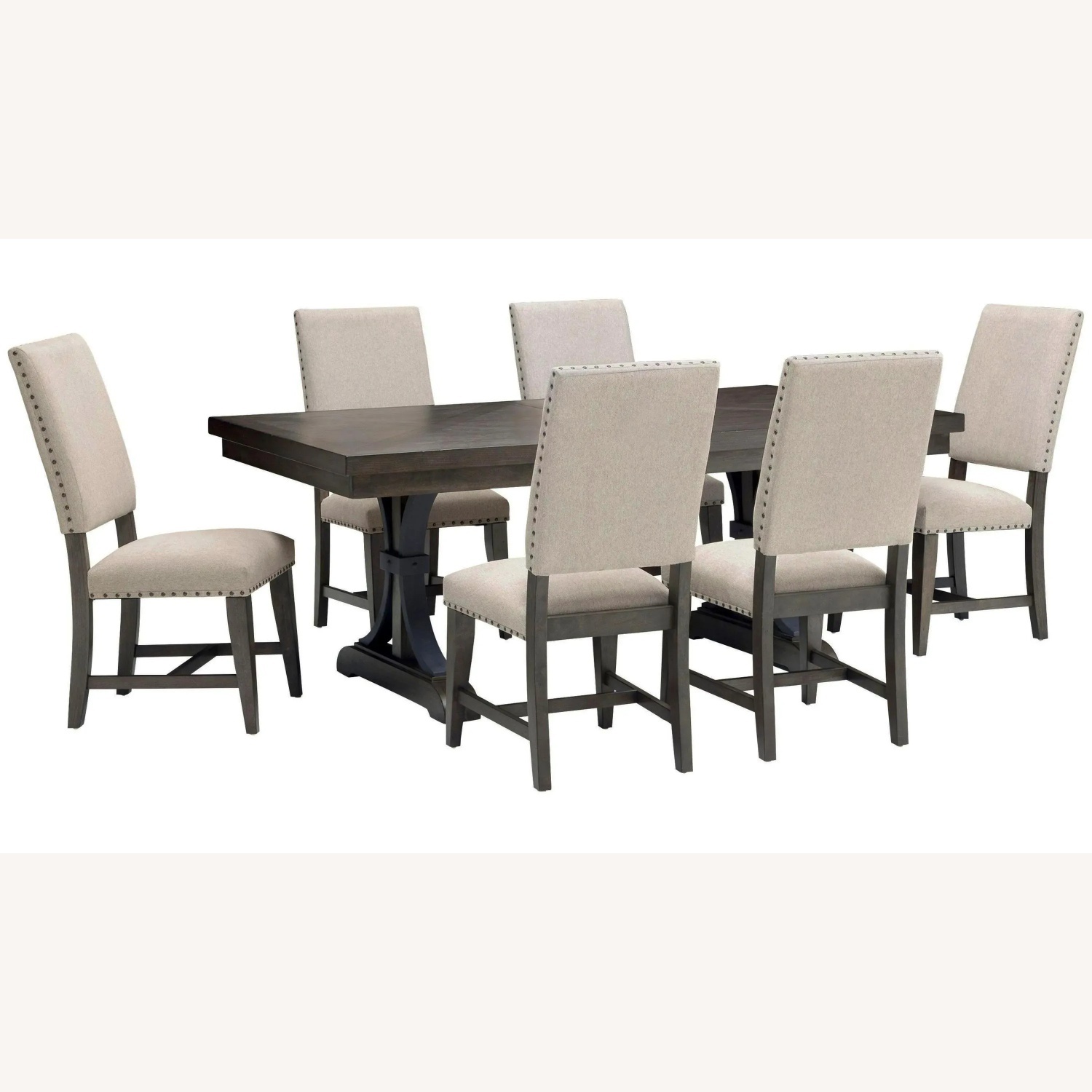 When it comes to the Halloway 7-pc. dining set, strong lines and eye-catching detail create a transitional look that serves up fine dining for a variety of decorating styles. Distressed, espresso finish and parquet pattern oak veneers showcase this set's natural beauty, while details like nailhead trim add a rustic touch. The upholstered chairs feature neutral colored fabric and are sure to make the sit-down dinner a comfortable experience. Matching Table Protector