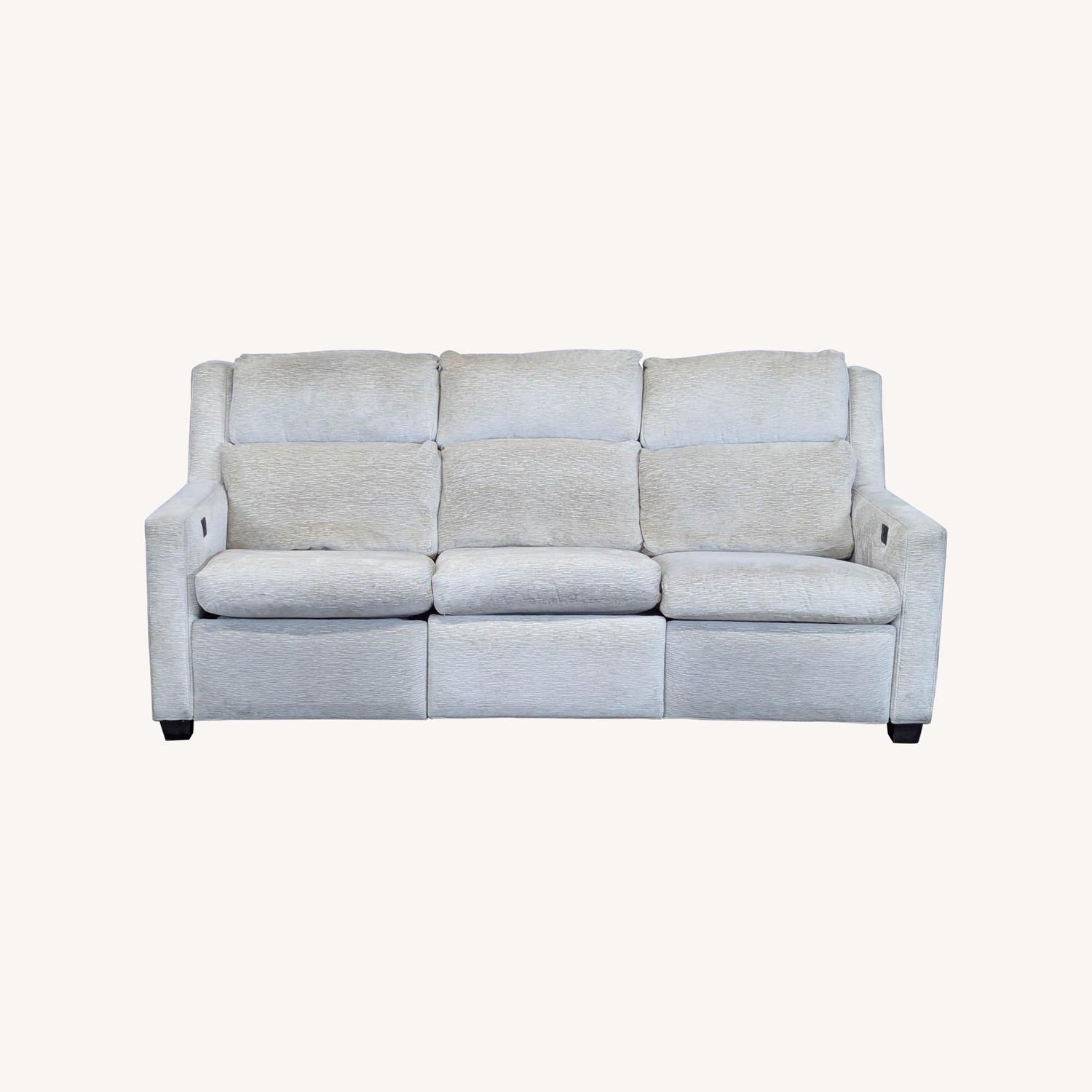 Seller's Notes:Hancock and Moore ‚Your Way‚ Power Reclining Sofa with Jessica Charles ‚Dynasty‚Fabric Color Cream. Features moving head rest and recliner with adjustable settings and USB Ports.