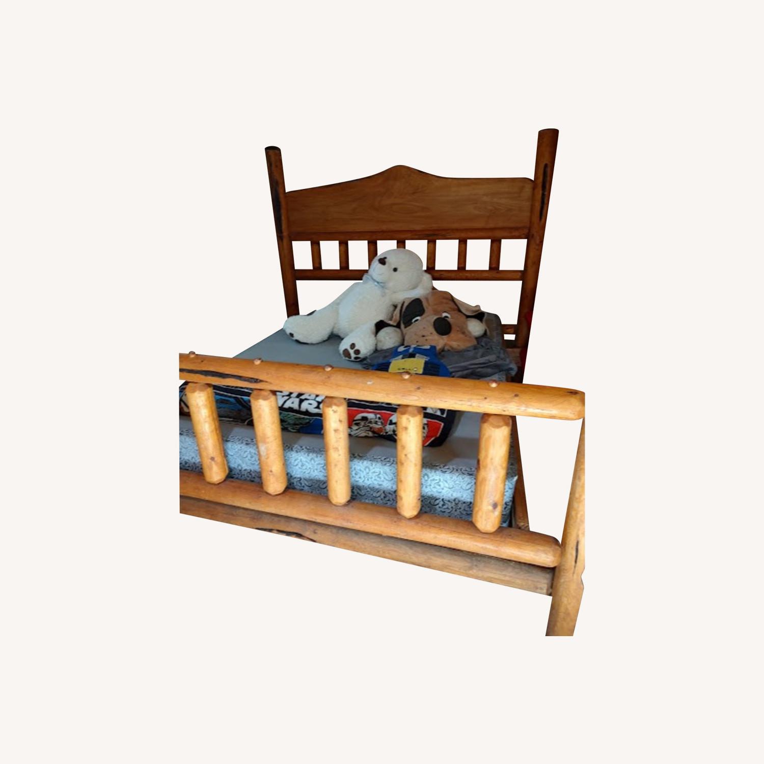 Seller's Notes:I purchased this hand-crafted head and footboard (I have support slats) for my son in 2012. He moved out-of-state and did not take it with him due to its size. Pictures do not do it justice. It is cedar with all natural wood imperfections. Can adjust to king, queen, or full, depending on where you place the slats. That is my hand (adult female) in the picture to illustrate size. This would make a beautiful addition to a cabin or rustic home.