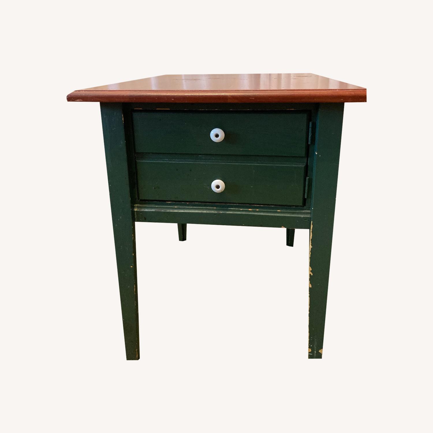 Seller's Notes:I PURCHASED OVER FORTY YEA4S AGO AT A HIGH END CRAFT SHOW FROM A DEALER WHO HANDMADE HIS TABLES. IT IS SOLID CHERRY AND PAINTED DEEP GREEN. WELLMADE STURDY WITH A CABINET. GREAT TABLE ONLY SELLING AS I AM MOVING.