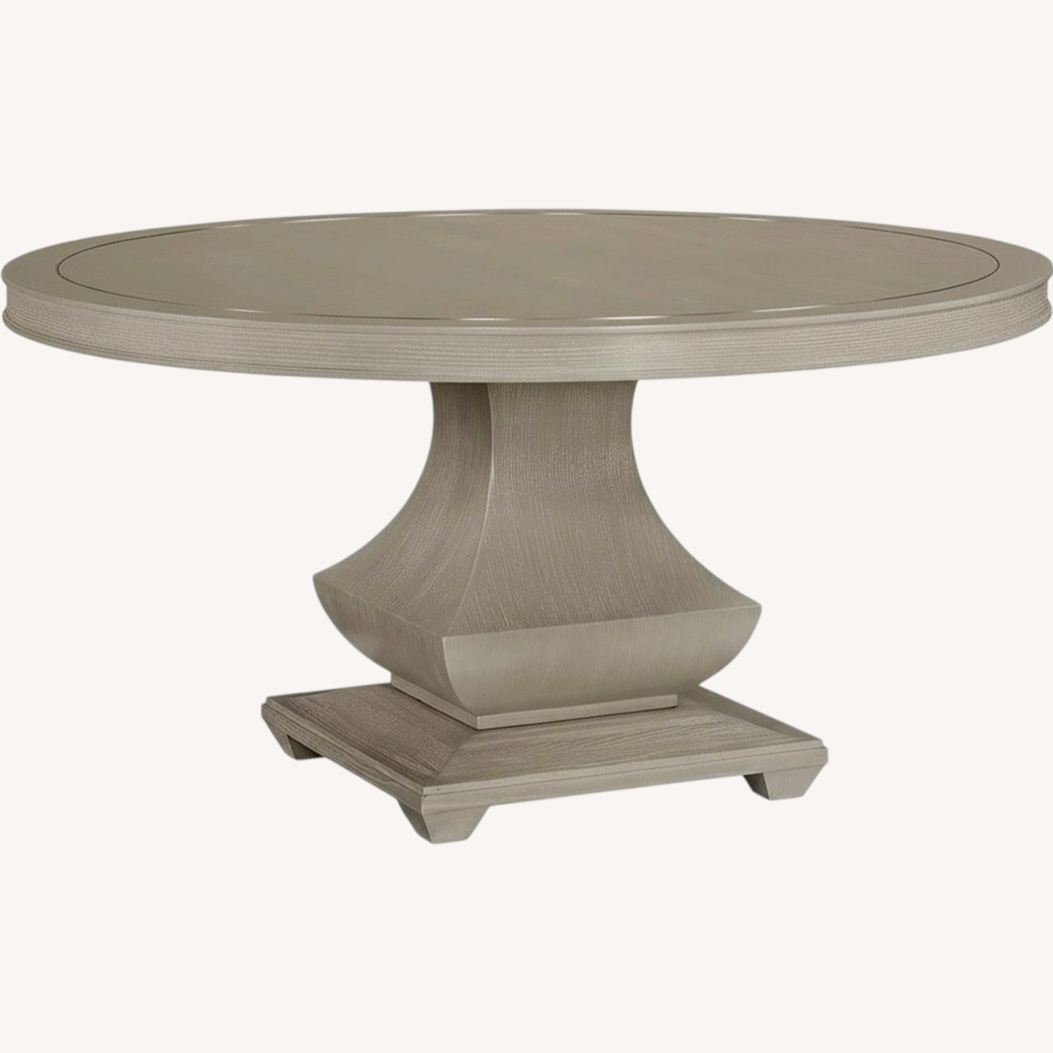 Seller's Notes:Chic heather grey wood round dining table with a uniquely-shaped pedestal base that needs restored due to scratches and peeling of wood on table top.