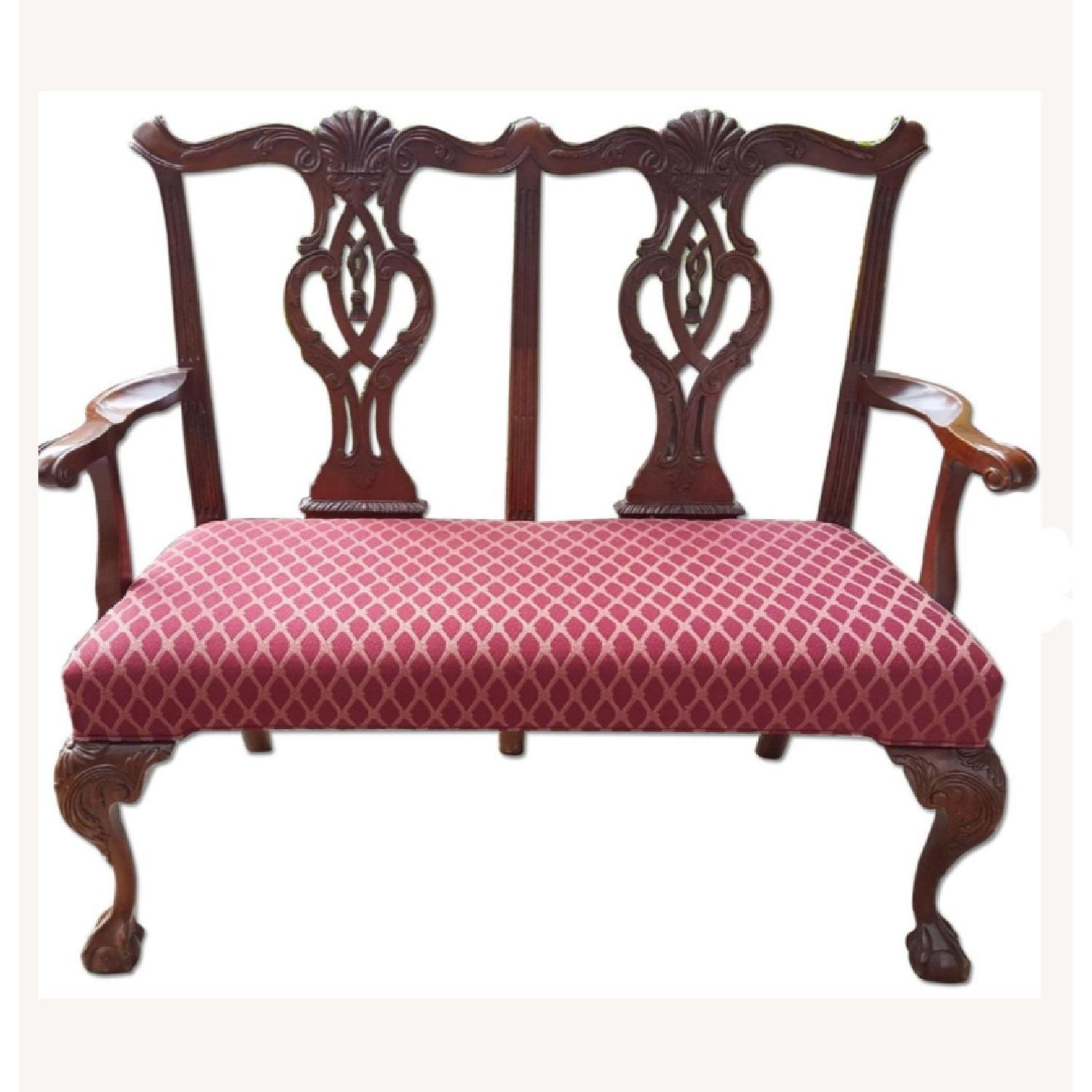 Seller's Notes:REDUCED FROM $650. For your consideration is this beautifully constructed Chippendale style bench from the Mount Vernon Collection by the Hickory Chair Company of Hickory, North Carolina (known the world over for fine furniture). This 45 inch wide bench is the perfect accent piece for any room in the house including the entry hall. Long enough to seat two but not too long to fit into most any small space. The piece stands alone as part of a major seating group or as an accent. It is sturdy and in fine condition with clean, lovely upholstery of maroon diamond fabric with mauve outlines. Made of mahogany, this timeless design has stood the test if time. It is reasonably priced and will pair up nicely with most any decorating style.