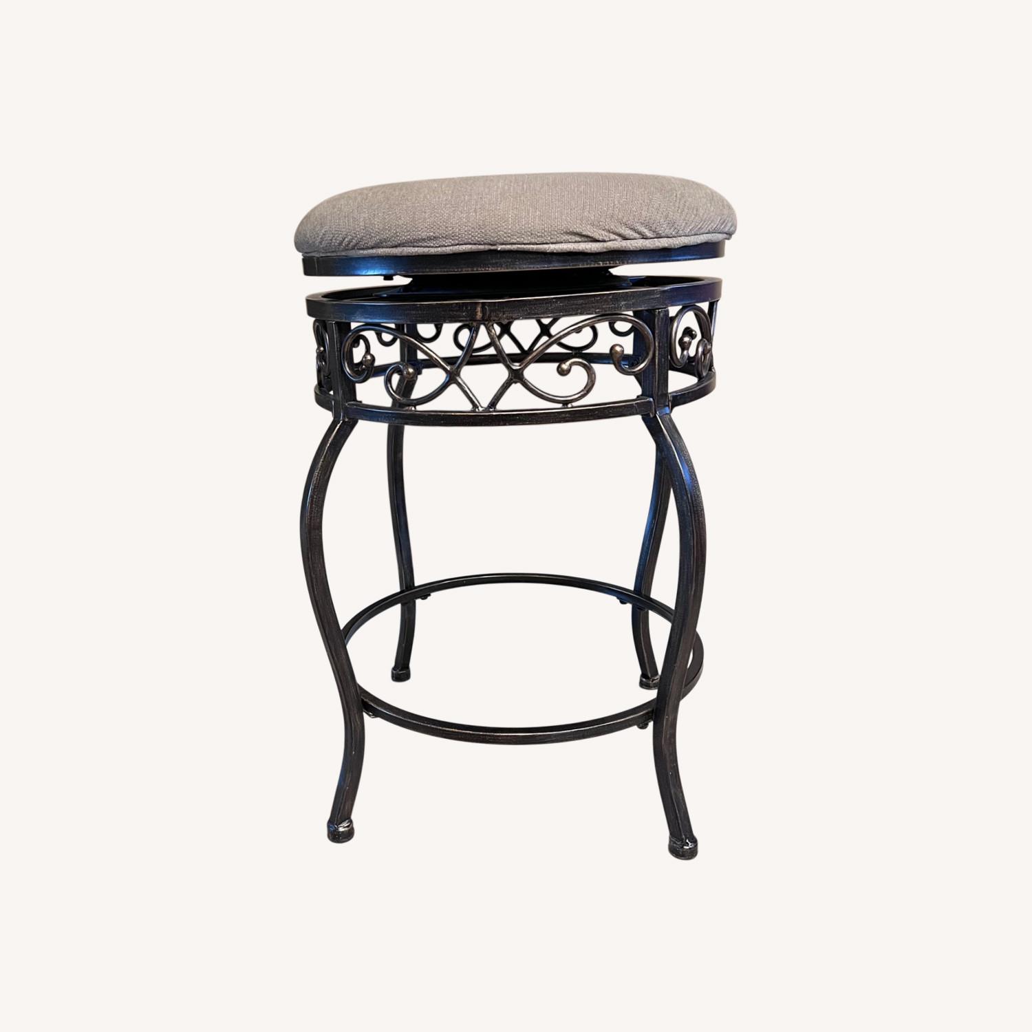 Seller's Notes:Gently used, minimal staining here and there (as pictured). Other than that no flaws. Colors: Dark Brown, Tan, Bronze Measurements are: Height: 26.5” Width: 17.5” Features: Swivel Seat, Fabric Cushions, Swirl Iron Design, Easy Cleaning Maintenance, Bar Stools, Island Seating, Breakfast Bar, Backless Stools
