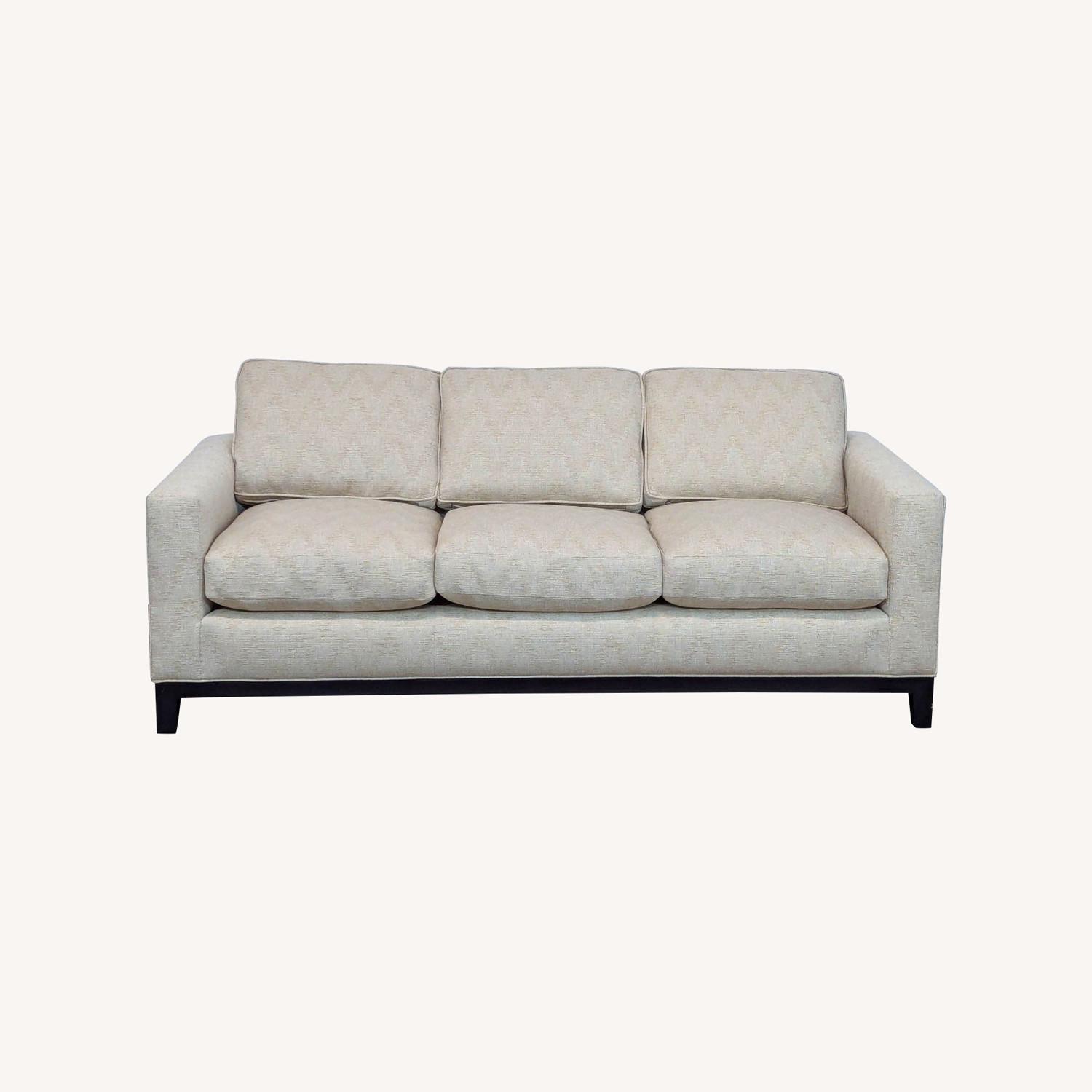 Seller's Notes:This three-seat sofa designed by renowned French designer Christian Liaigre for Holly Hunt exemplifies Liaigre’s signature minimalist aesthetic with clean, architectural lines, low-profile track arms, and plush, deep cushions for exceptional comfort. Newly reupholstered in a neutral, textured fabric with subtle patterning, the sofa rests on dark-stained wood legs.