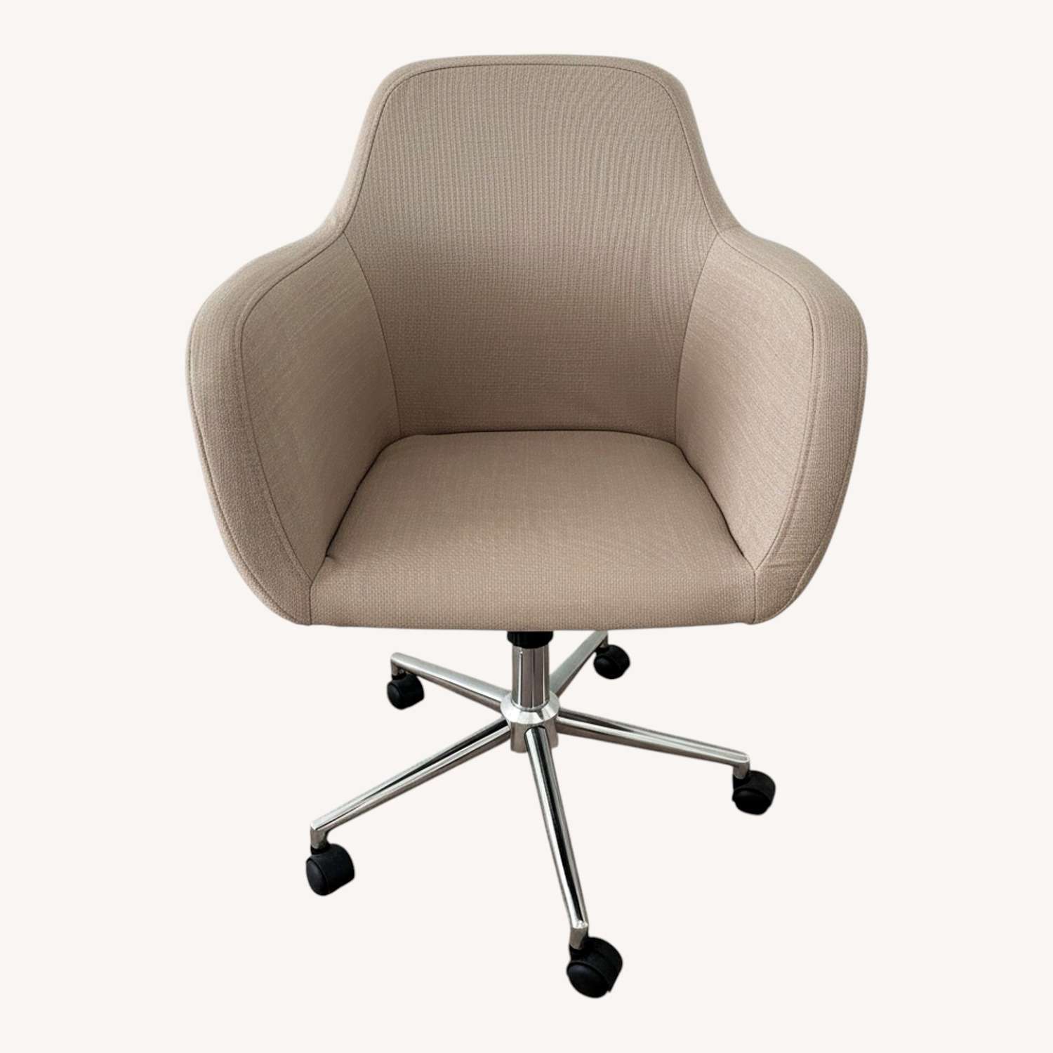 Wear and tear details: Tan colored office chair in perfect condition with no blemishes