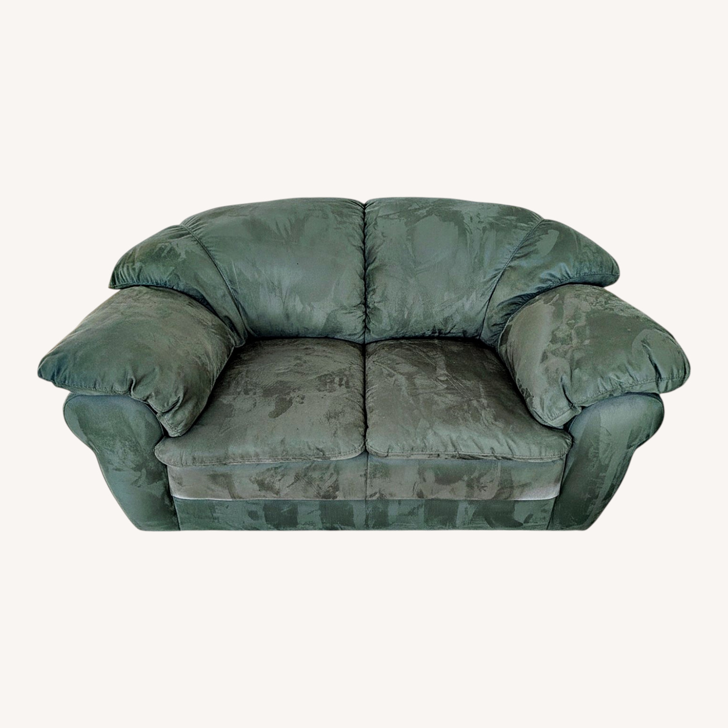 Seller's Notes:Loveseat in hunter green microsuede. Deep, plush cushions — full and firm. The velvet-like fabric has a nap that shifts with light. (Matching 3-seat sofa listed separately) Loveseat: 65"L × 33"D × 34"H, seat depth 21" Condition: Good. Minor stains on seat and back cushions — clearly shown in photos. We haven't attempted cleaning; they may come out. No tears or structural issues.