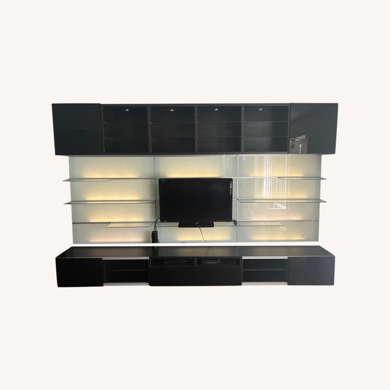 Seller's Notes:Beautiful pierce, includes backlights on glass, lights in overhead units and opening for tv to be hung. 4 (20 inch glass shelves) 3 (48 inch glass shelves)