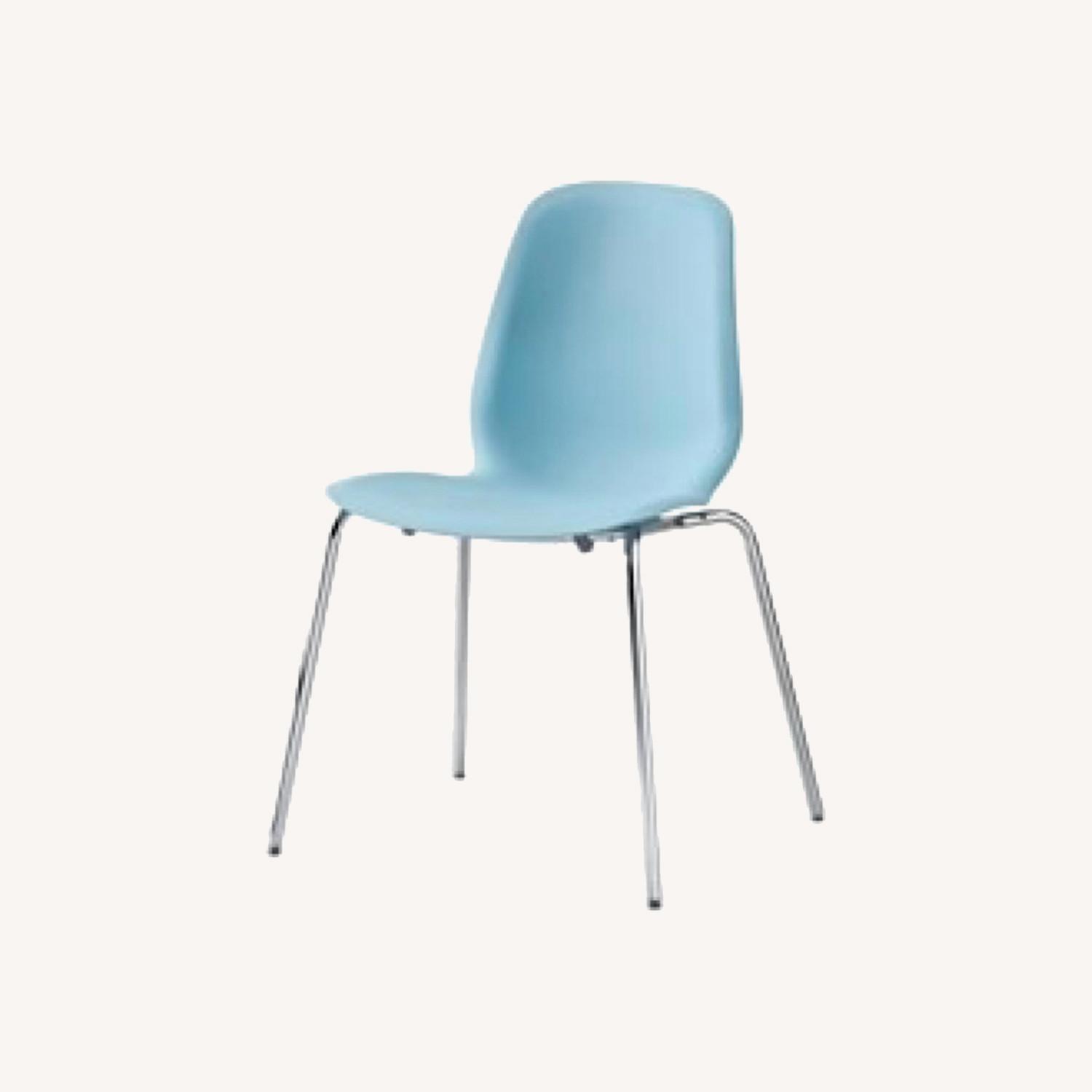 Seller's Notes:Gently used IKEA dining chairs in sky blue with chrome plated legs. Four chairs sold as a set. Retails at 110$ per chair pre tax.