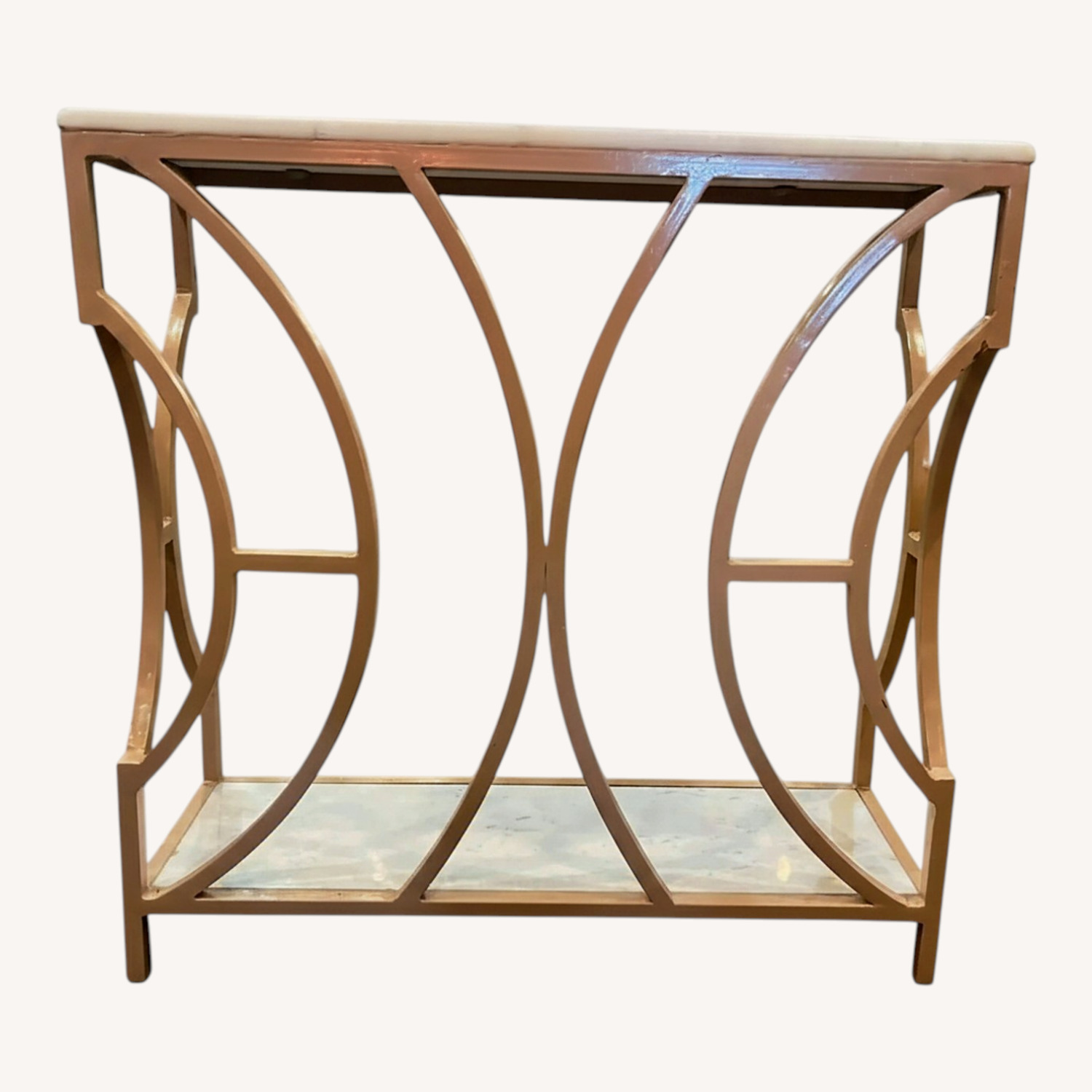 Seller's Notes:This very elegant Deco style console table has curved gold iron with solid marble top and base. this beautiful piece could be used behind a sofa, in an entry, or even under a television. Manufacturer: Iron Butterfly Size-35”H x 12”D x 35”W