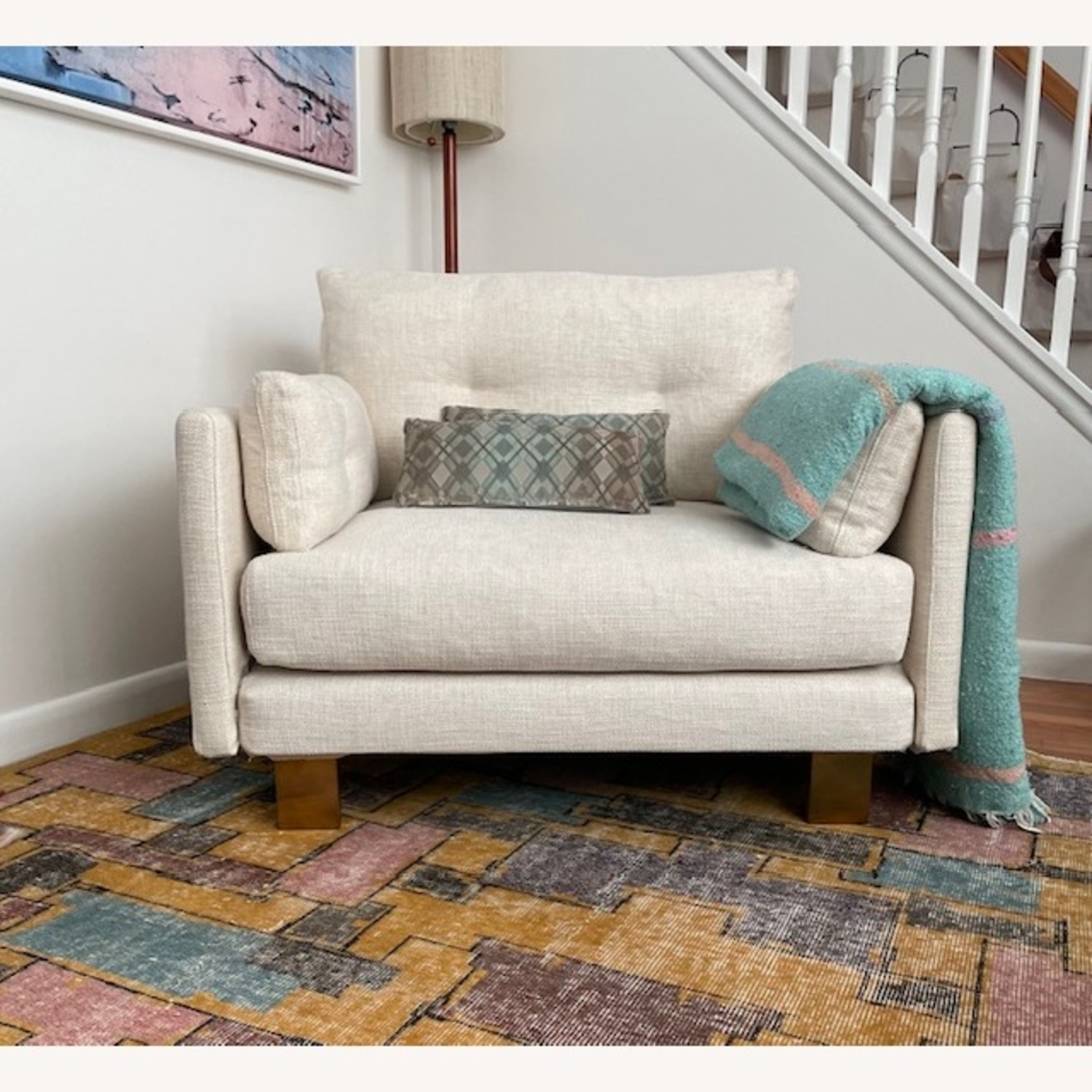 Seller's Notes:Large square armchair JA Malibu line, in ivory color chunky cotton/linen plain weave, with brass legs. From pet-free, smoke-free home. Spacious and comfortable, with firm, low seating, it is in excellent condition. Upholstery can be removed. I am selling after move to place with smaller living room. No stains or marks, it is a clean neutral, which can match any color scheme. Height of chair structure is 22 inches all round, with back cushions, 31 inches. Seat to top of back cushion about 15 inches.