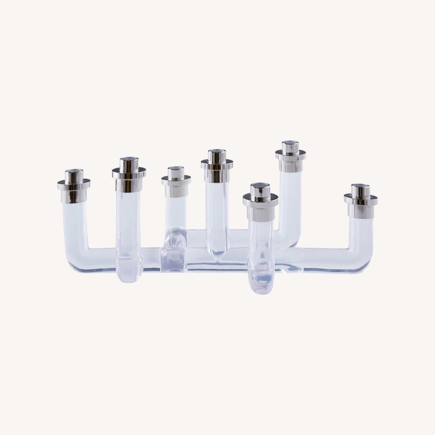 Seller's Notes:Pipe Up. 70s inspired patterns meet daring dimension. The Pompidou Candelabra features solid acrylic pipes of staggered heights fused together and accented with shiny nickel caps. The mood-setting centerpiece your modernist table needs. In luxe clear or posh celadon acrylic.