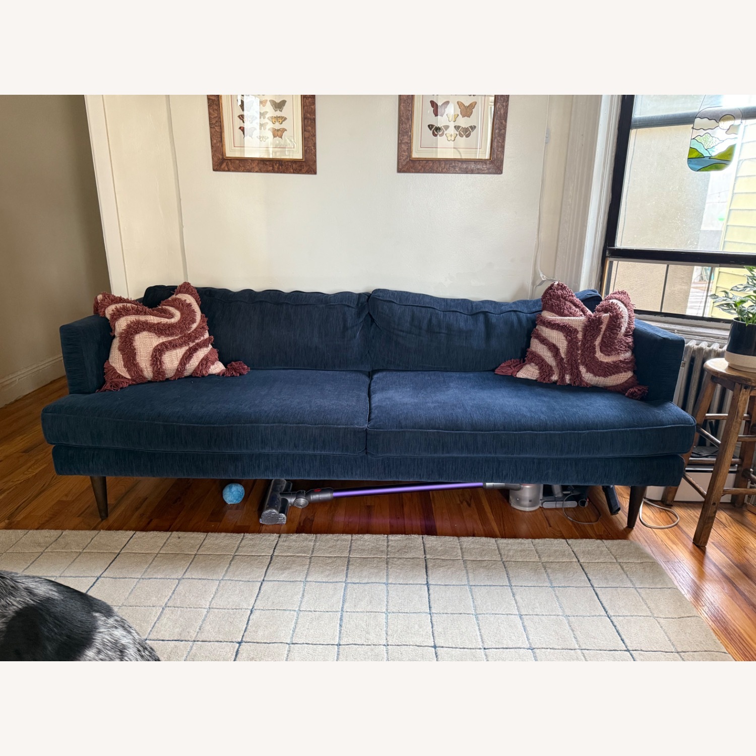 Seller's Notes:Selling our 86” blue Joybird Preston sofa. Originally purchased for $2,000. It’s been great we’re just looking for a different style. Comes from a dog household, but will be fully vacuumed before pickup. There’s one small light spot on the right cushion, as pictured. No other stains or tears.