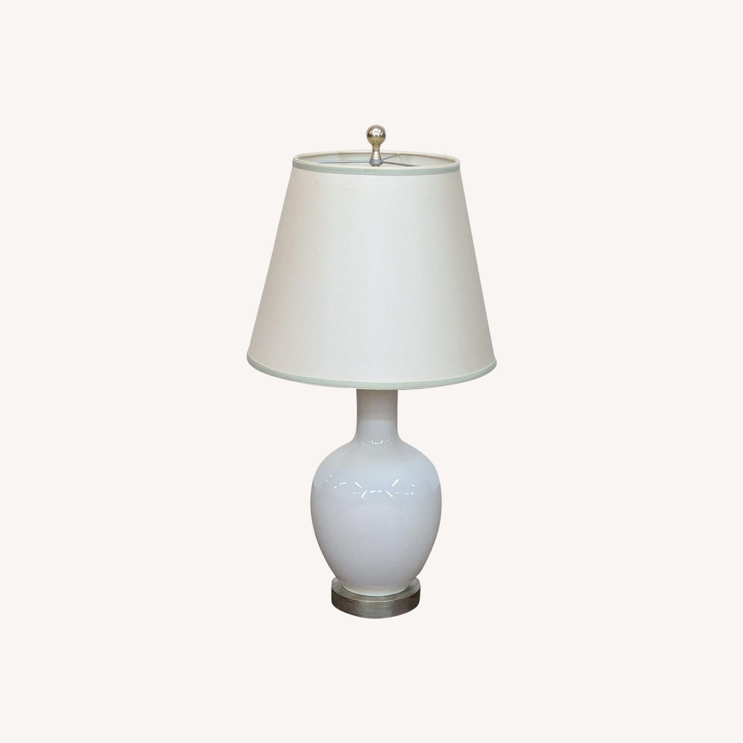 Seller's Notes:This Kendall Wilkinson Design table lamp features a white crackled glass base on an antique silver base with two light sockets and fabric shade.