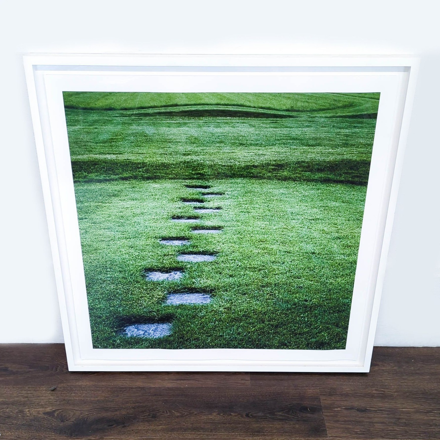 Seller's Notes:Framed print featuring a green landscape and stone path. The vivid print comes in a modern white frame.