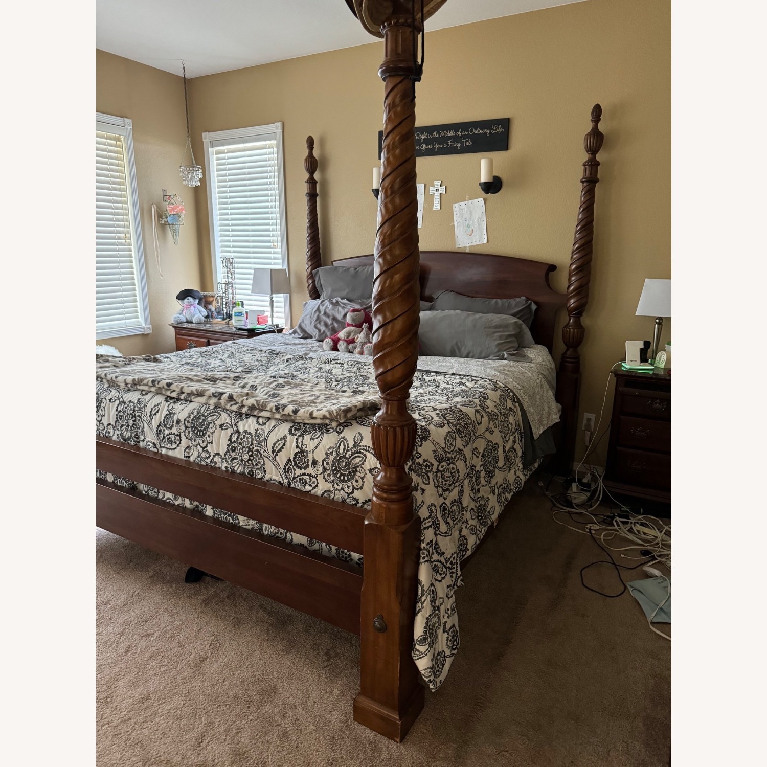 Seller's Notes:Elegant wooden four-poster bed with intricate carvings. Solid wood Kincaid heirloom set, standard king, two night stands with granite tops, dresser and armoire. It is a beautiful set with solid construction. They don’t make furniture like this anymore - willing to consider best offer.