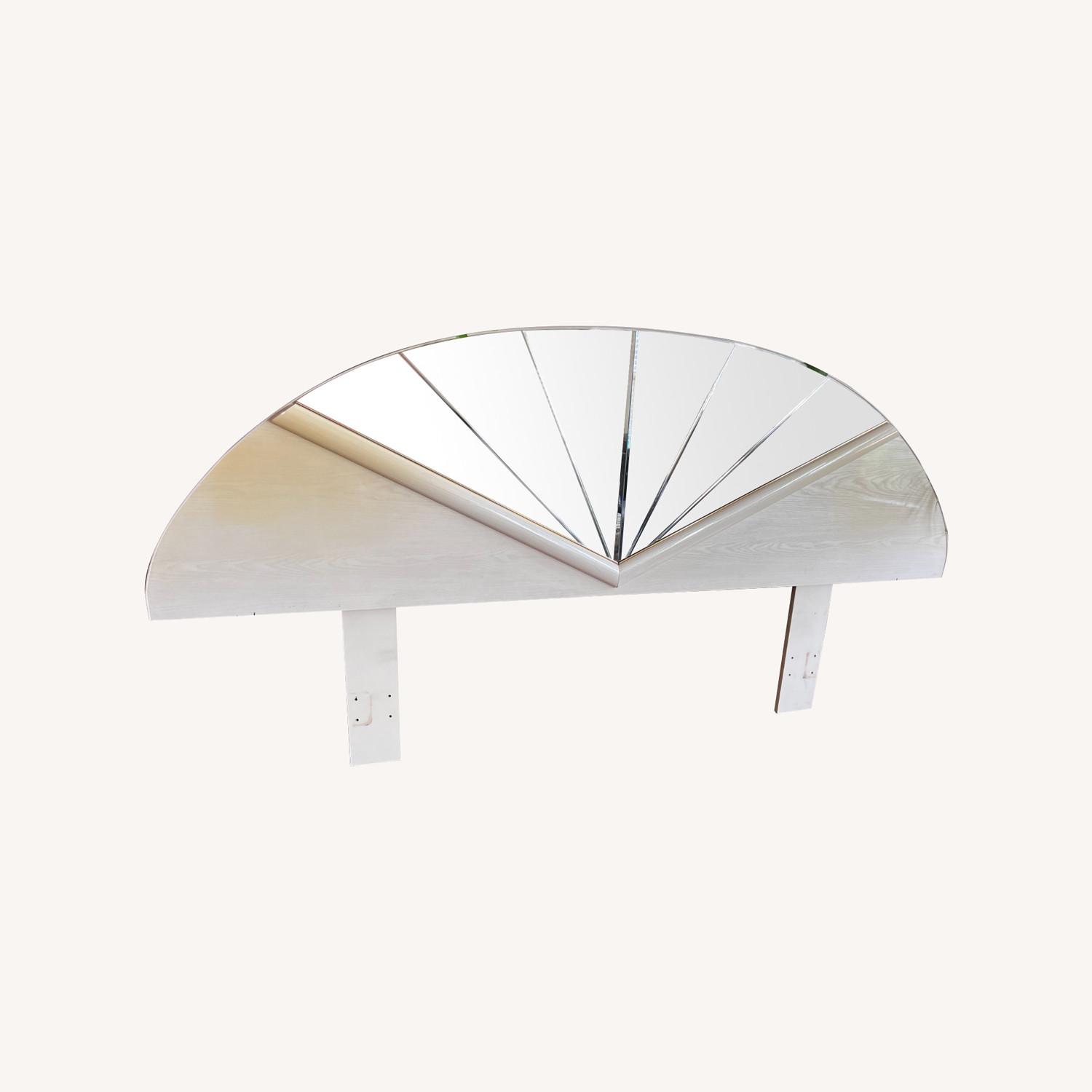 Seller's Notes:Picked up this headboard from a vintage shop two years ago and have loved every moment with it! It fits both king and queen size beds. Pictured you'll see I had it on my queen bed and put a green light to glow behind it (selling without light). The mirror panes have no damage and are very easy to clean. There is slight discoloration on the left side but it is not noticeable in most lighting. Super easy to pop behind a bed or attach to a frame (bottom holes show where it was previously attached to my frame). It is not heavy but a bit wonky trying to carry. Recommend two people carrying because it is fragile with the mirrors.