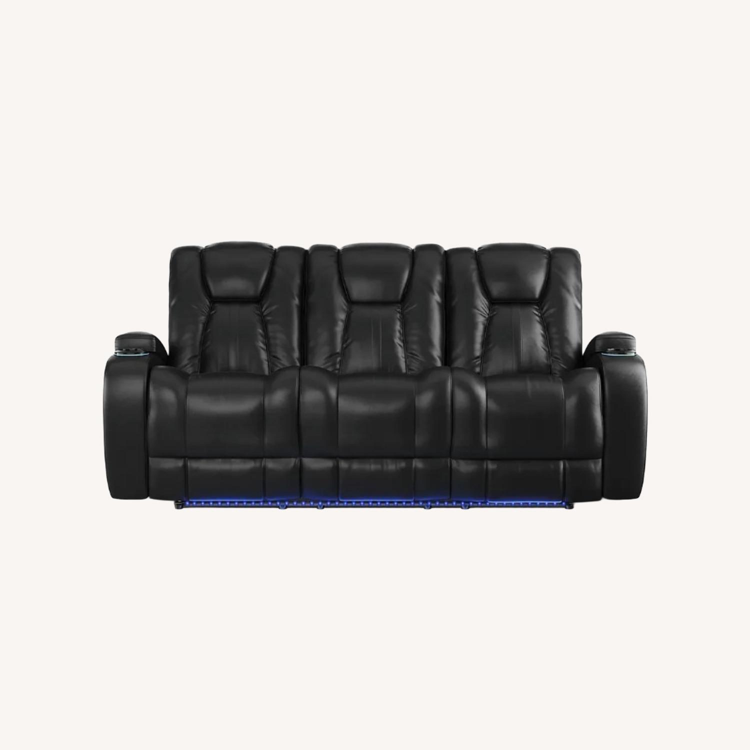 Seller's Notes:The Kingvale Court dual power reclining sofa has everything you need to settle in and stay comfy for the long haul. Upholstered in luxuriously supple black fabric, this deluxe sofa features a storage compartment and lighted cup holder in each armrest in addition to a pull- down center seat back boasting a tray with two cup holders, twin reading lights, and two wireless chargers. Power reclining headrests and footrests keep every inch of your body supported with the touch of a button. Adjustable LED floor lighting provides just the right amount of light when needed. 24" extension when footrest is fully reclined. Allow 6" for wall spacing. Upholstery: 82.5% Polyester, 17.5% Polyurethane.