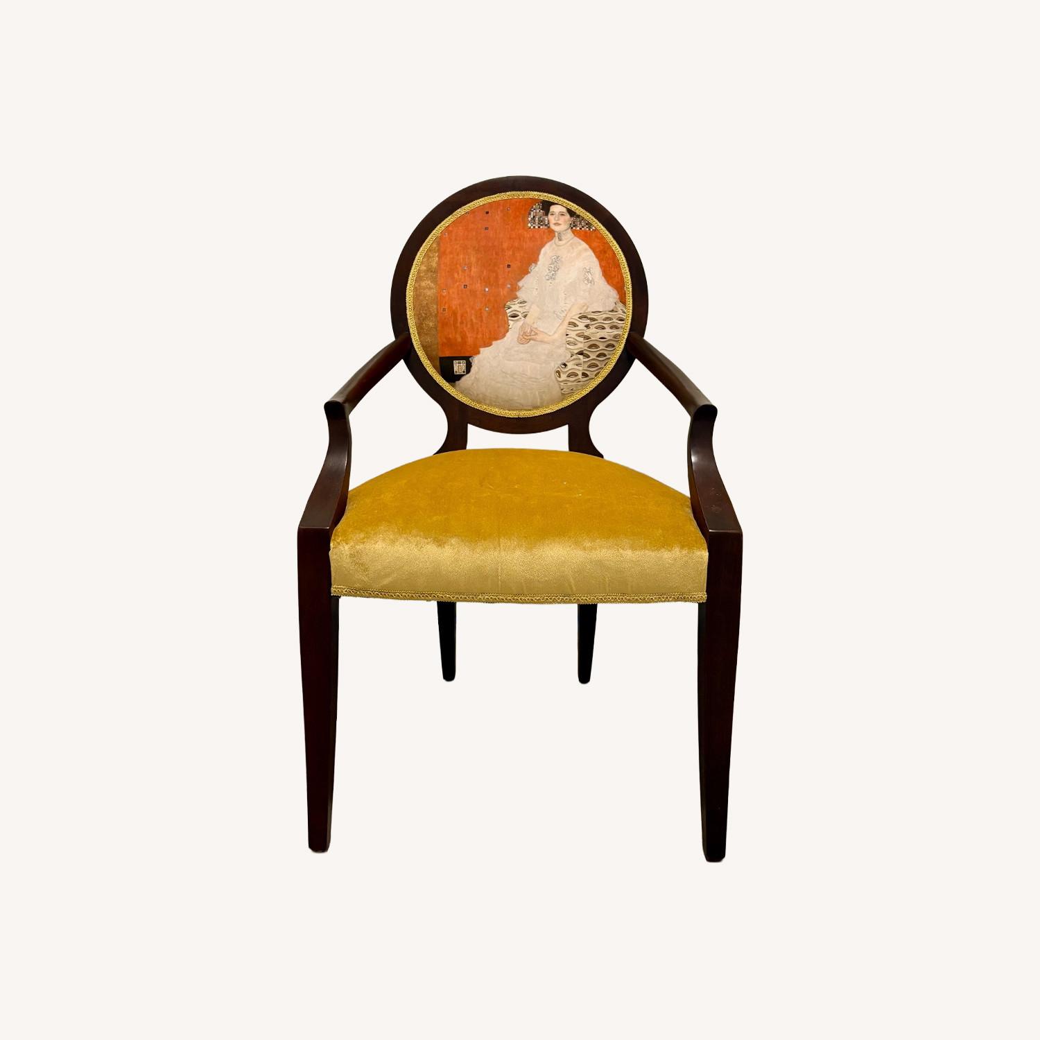 Seller's Notes:New Upholstered arm chair with Klimt painting printed on fabric back rest, and golden velvet fabric seat