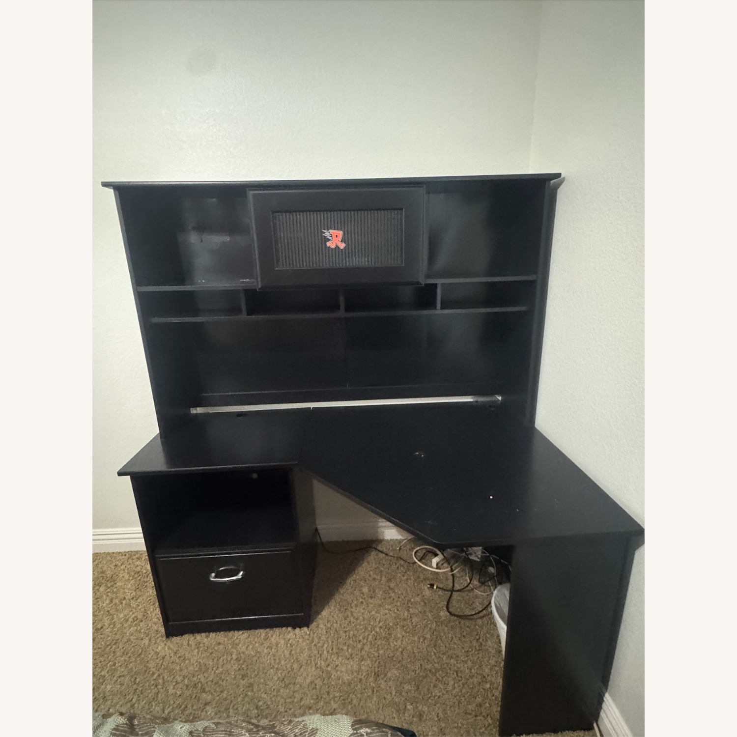 Seller's Notes:elling a spacious and sturdy L-shaped corner desk with an attached hutch. This desk has been recently finished in a sleek black color, making it a great modern addition to any home office, bedroom, or gaming setup. Key Features: Space-Saving Design: Fits perfectly in a corner to maximize room space. Ample Storage: Features a hutch with upper shelving and a center cabinet (with mesh door) for books or display items. Organization: Includes a slide-out keyboard tray, a bottom drawer, and an open cubby shelf for easy access to essentials. Sturdy Build: Solid construction with a large workspace. Dimensions: Length: 59 inches Total Height: 66 inches Desk Depth (Narrow side): 19.5 inches Desk Depth (Corner/Deepest side): 36 inches