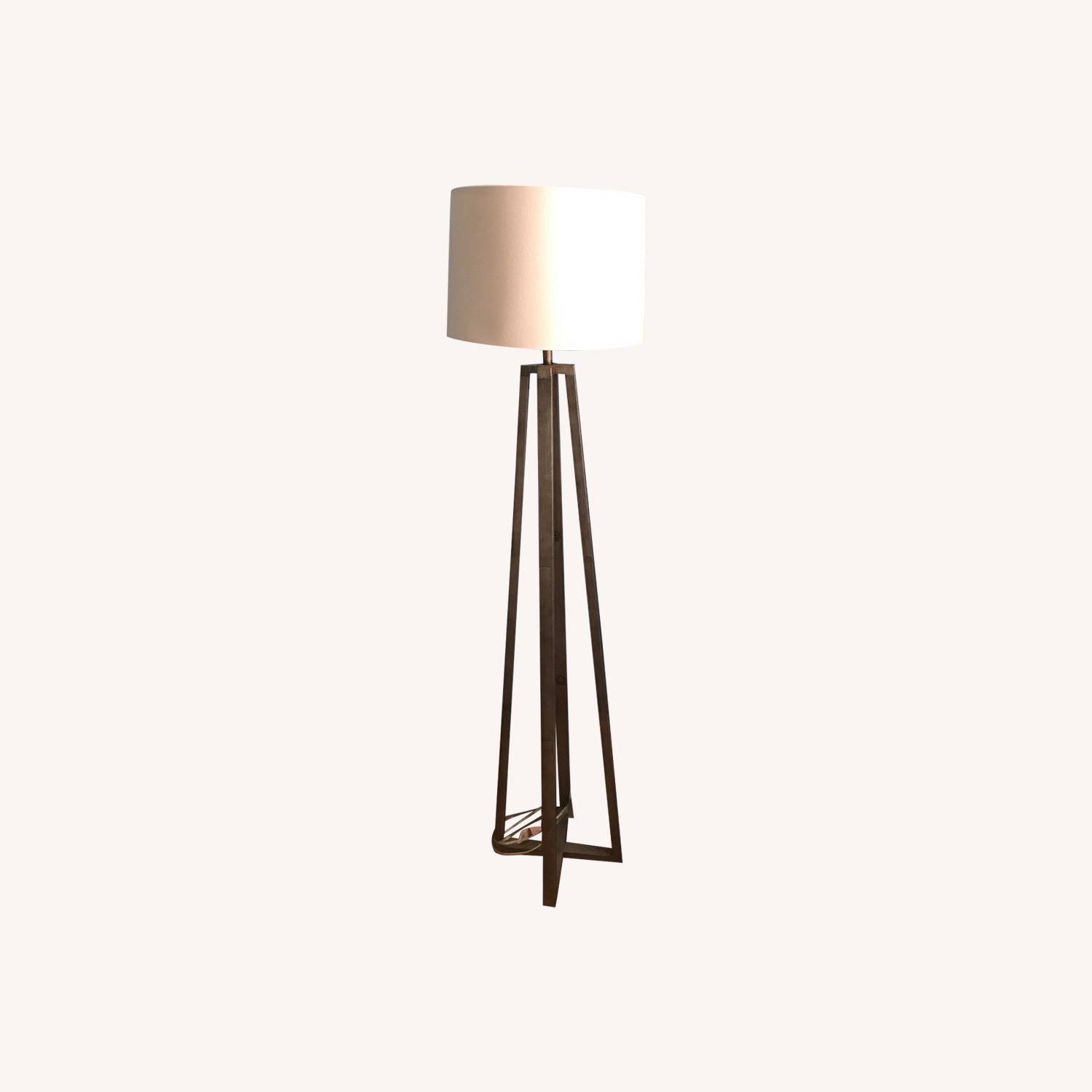 Seller's Notes:Lamp Dark silver Base with texture White Shade Don't know brand. Nice lamp. Good condition. About 5 feet tall. Lampshade is about 14" diameter
