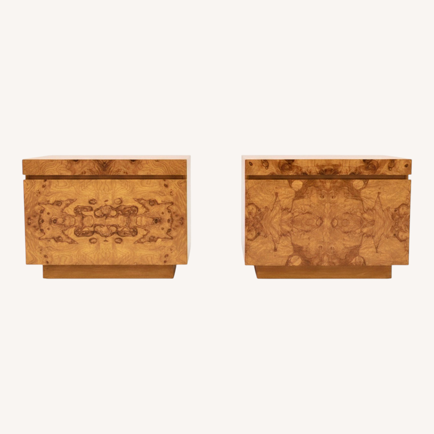 Seller's Notes:With their timeless burl wood detailing and minimalist modern design, these nightstands are a true statement piece. Each features one spacious drawer and a pull-out shelf for added functionality. They’re in good vintage condition, with a few cosmetic imperfections that add character