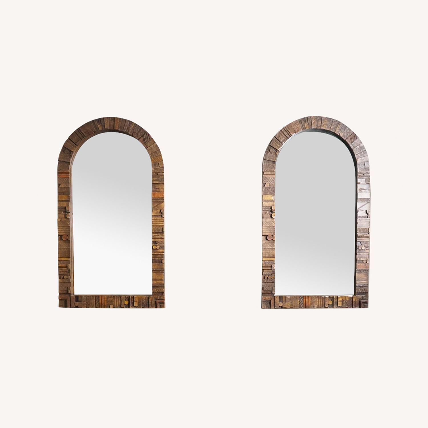 Seller's Notes:Pair of 1970s Mid-Century Modern Brutalist Pueblo mirrors by Lane. Intricately laid, highly textured pattern adorns these arched top mirrors. Rough-hewn forms exemplify the Brutalist aesthetic made famous by Paul Evans. The bold, monumental form is sure to make a statement in your space. Dresser sold separately. Creator: Lane Acclaim (Designer) Dimensions: Height: 45 in (114.3 cm)Width: 25 in (63.5 cm)Depth: 1.5 in (3.81 cm) Sold As: Set of 2 Style: Mid-Century Modern (Of the Period) Materials and Techniques: Resin,Wood,Molded Place of Origin: United States Period: 1970-1979 Date of Manufacture: circa 1970s Condition: GoodWear consistent with age and use. Mirrors are in very nice vintage condition with minor age appropriate wear. There are some minor scuffs and dings but nothing serious or glaring.