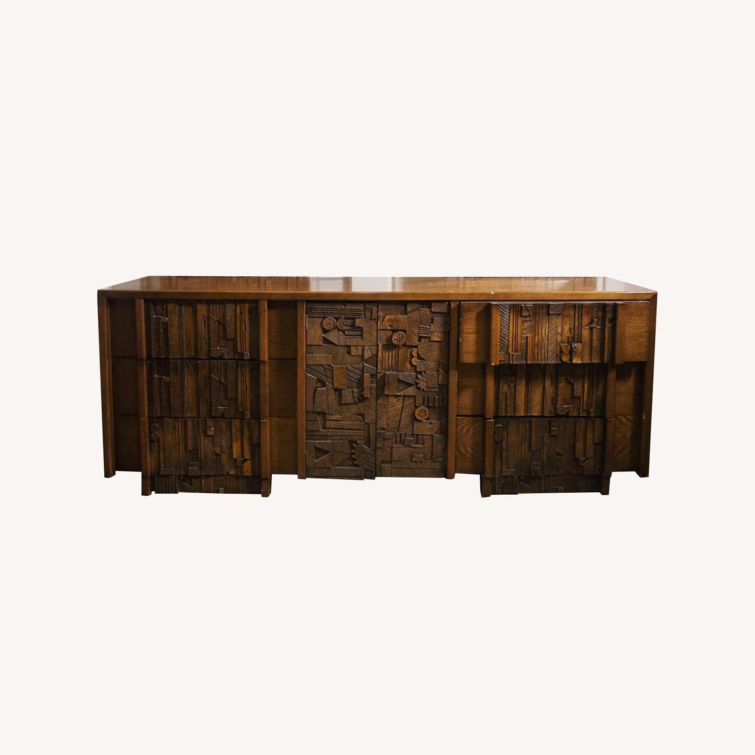 Seller's Notes:Mid-century modern long dresser by Lane for their "Pueblo" series. Adorned with mosaic style wood collage, making a striking brutalist style front. Nine wide drawers. Great statement piece for your bedroom. Mirrors sold separately.