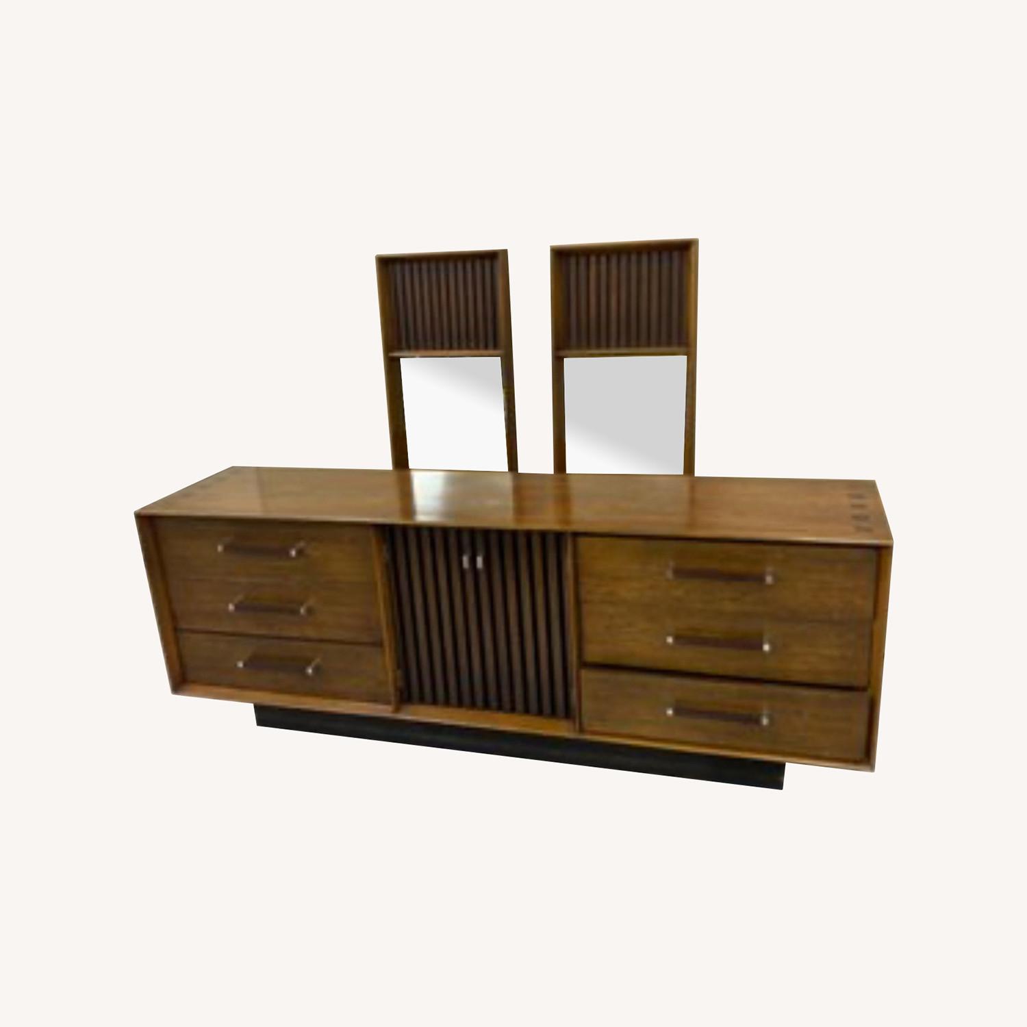 Seller's Notes:This vintage Lane Tower Suite Mid Century Walnut And Rosewood Lowboy with both mirrors (including hardware!) is in excellent condition. This rare piece of mid century modern furniture is a statement piece for any bedroom.