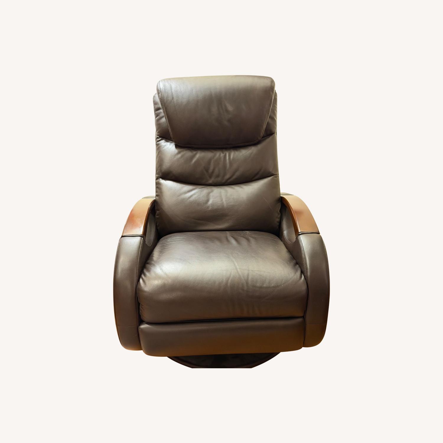 Seller's Notes: Brown Leather Manual Swivel Glider Recliner * Pillow soft leather covered cushions provide exceptional comfort and support * Beautiful curved arms with an elegant wood finish * Leggett & Platt steel reclining system with levered kick-out mechanism for effortless reclining * 360° swivel rotation pedestal base In pristine condition, gently used by one owner- no stains, tears or scratches