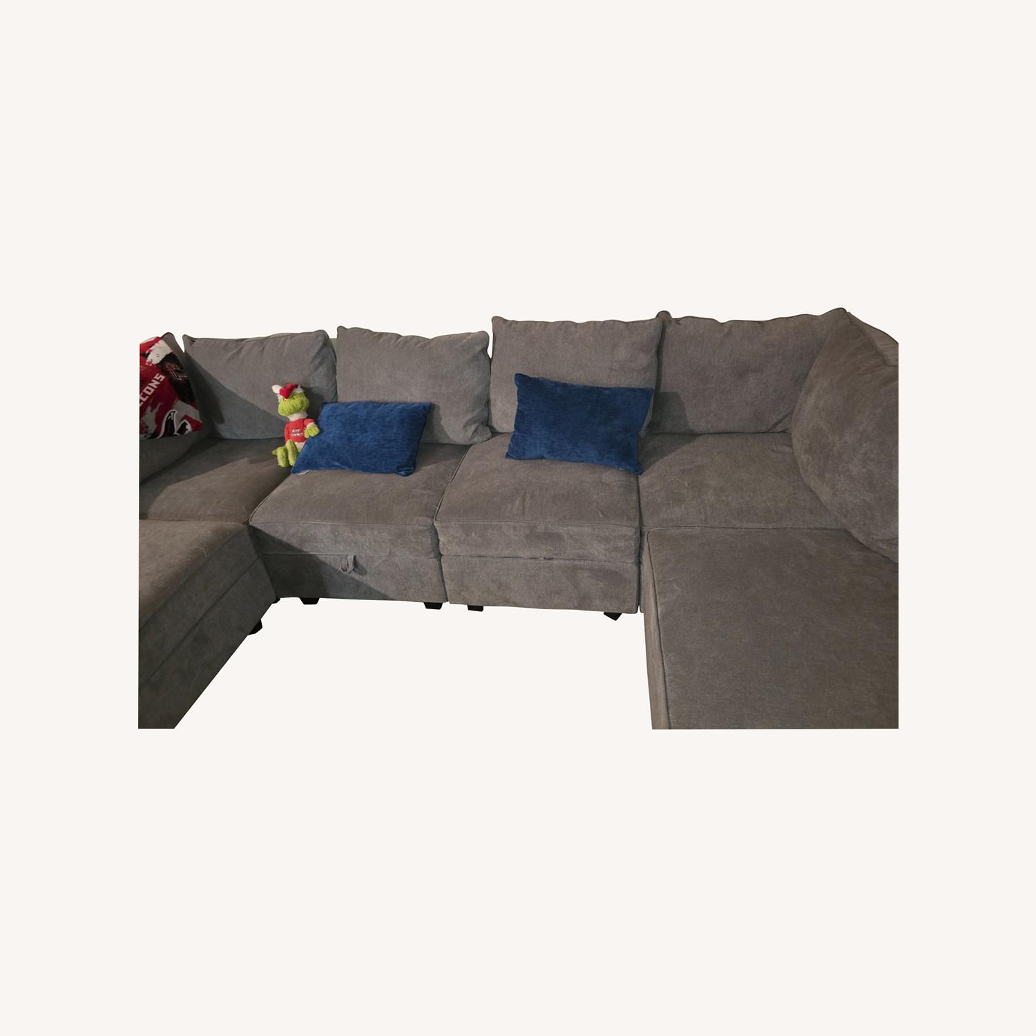 Seller's Notes:Nice family sectional. In good condition Minor threads on the sectional. Has storage space underneath cushions!