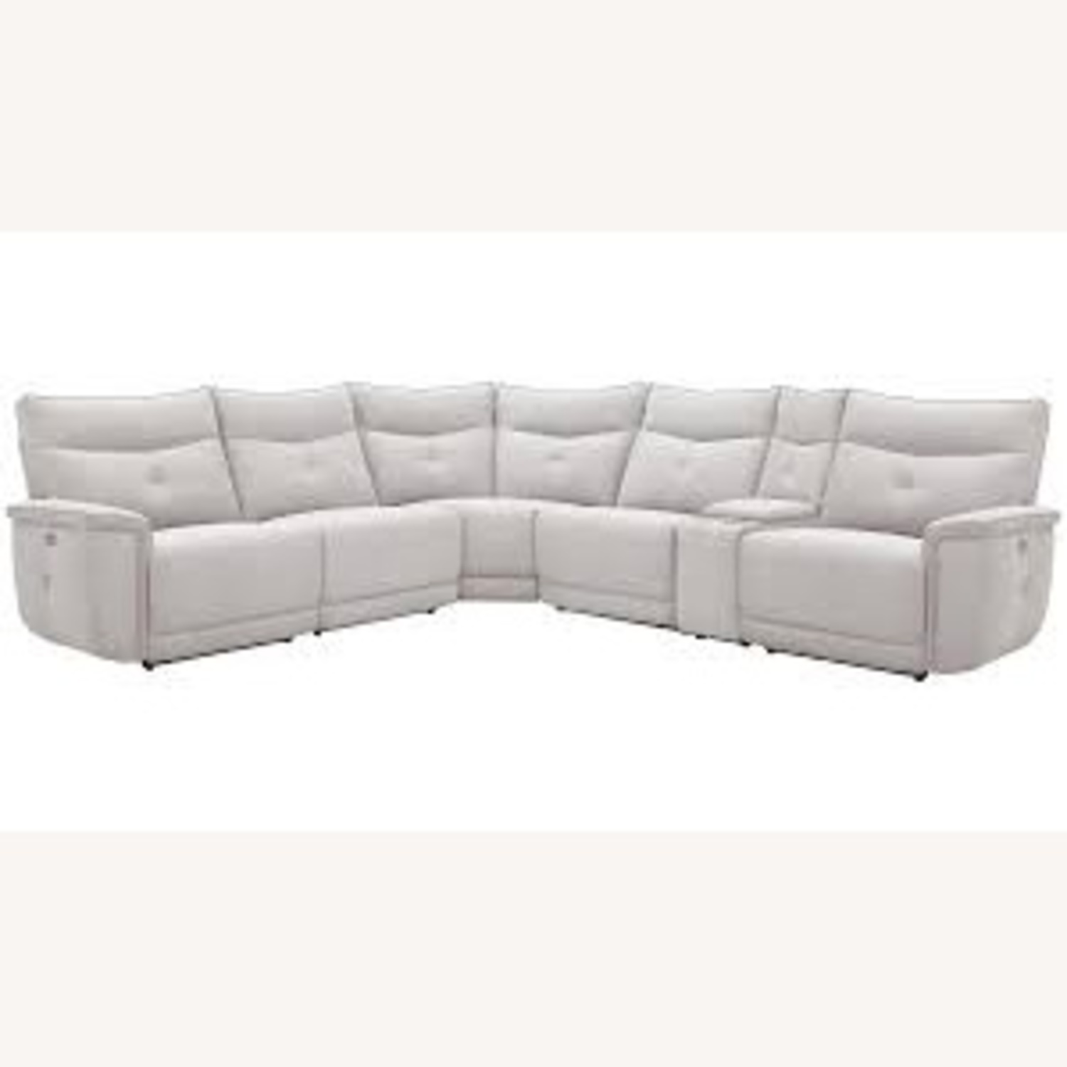 Seller's Notes:Purchased new from Raymour & Flanigan and kept in a clean, smoke-free home. Modern light-gray fabric modular sectional featuring power reclining seats and adjustable headrests, plus a chaise lounge and center console with storage and cup holders.