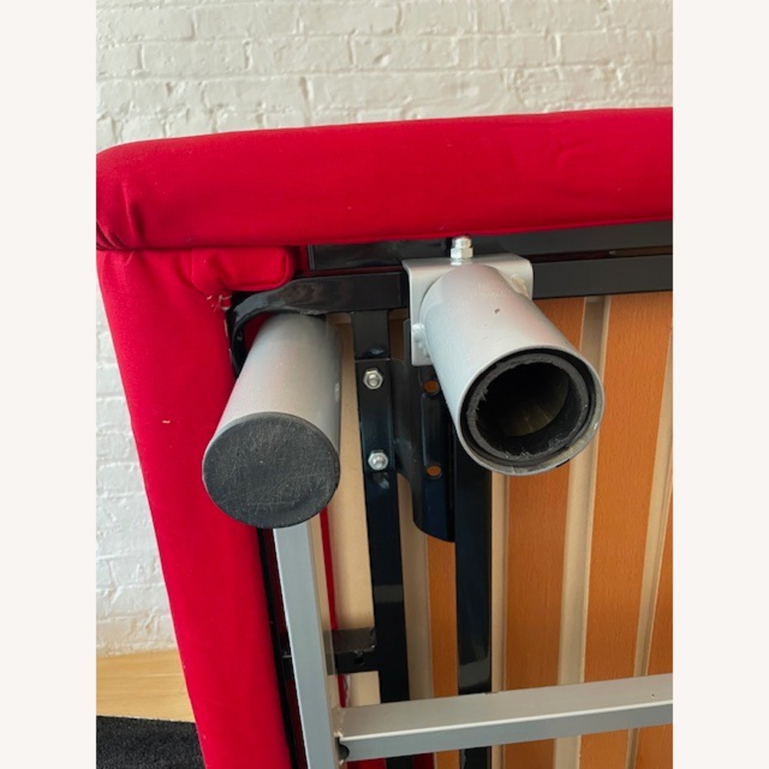 Seller's Notes:A gorgeous sofabed that we no longer have use for in current apartment. You'll notice some sun fading on the top of the backrest and also on the seat which takes the majority of wear. The mechanism still works very well. And any of the parts not in perfect condition (missing foot caps and taped slat) are superficial i.e. don't affect use and are not visible. The color is (I believe) Grenade (red) and fabric Amalfi (textured polyester).