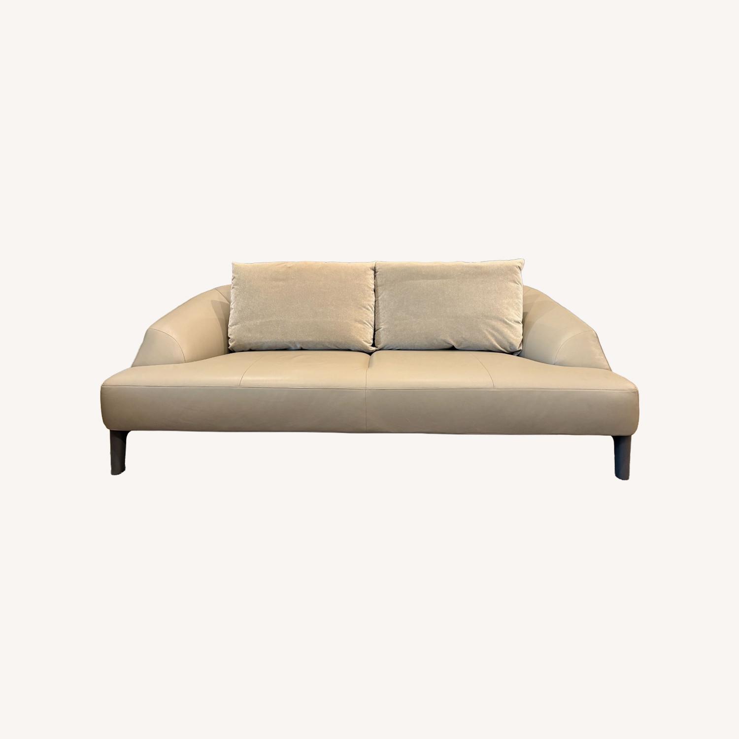 Seller's Notes:Beautiful custom Ligne Roset Sintra sofa. The back cushions were custom by made by our designer at time of purchase to create a softer look and feel. See photo of the order for description. Fabric matches the leather. No blemishes, lightly used by older couple. The leather is a taupe/light gray (taupe anline).