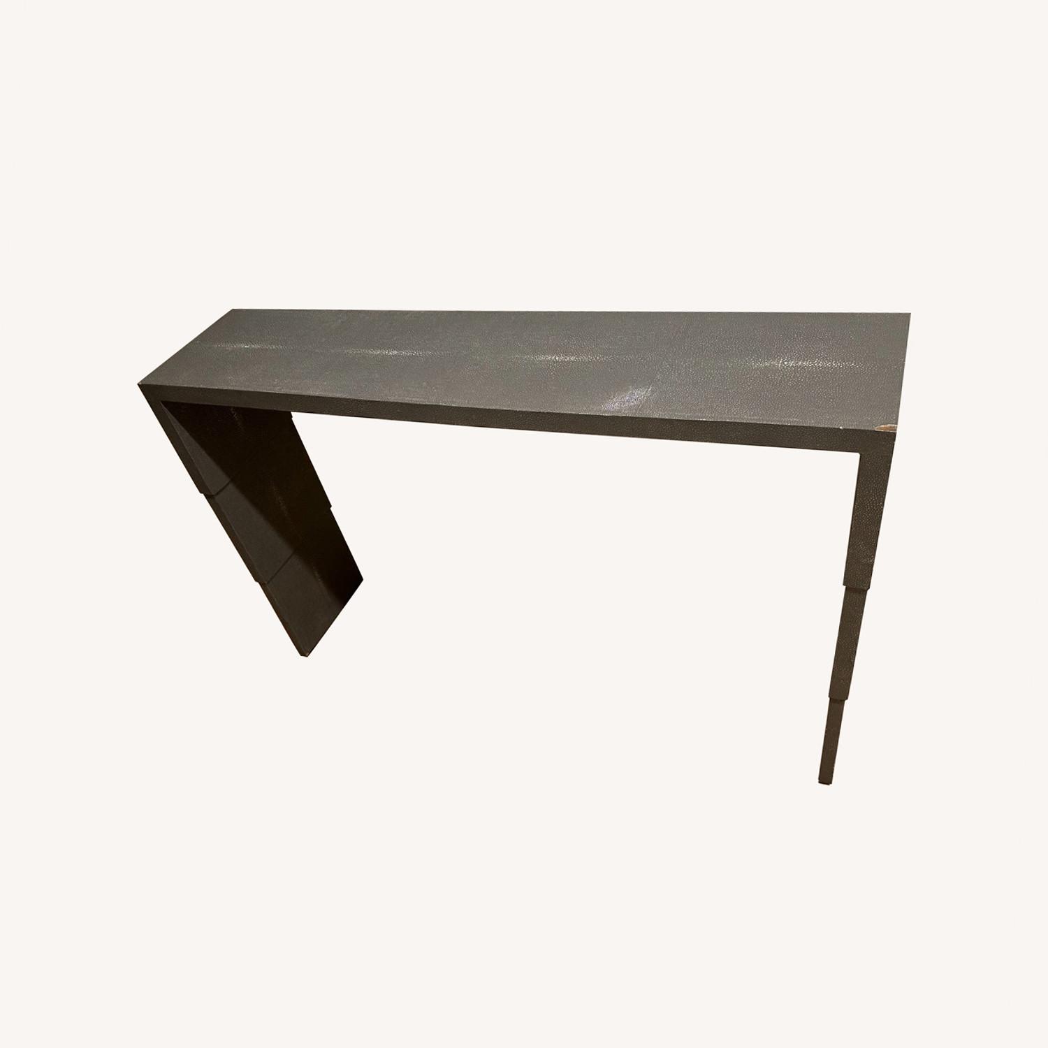 Seller's Notes:Shagreen console from Lillian August. Very elegant and the shagreen texture and pattern adds a nice touch. We had it along our entryway wall with a round mirror above, it looked stunning. Nice and thin depth (11" inch deep, which can be tough to find). Has levelers on the bottoms. Has a few marks of wear and tear on it, but less noticeable from a distance and not noticeable at all when you place picture frames/lamps/other decor on the surface.
