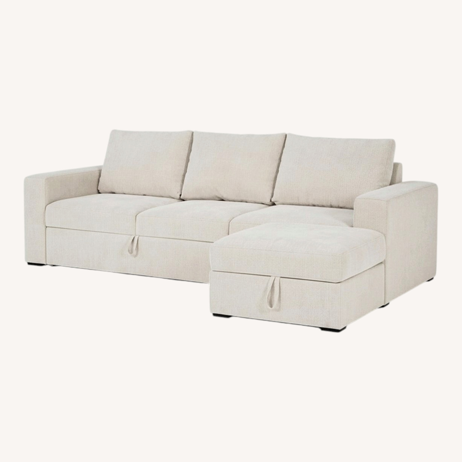 Seller's Notes:The Sebastian Cream White Beige Fabric 111" 2 Piece Convertible Futon Sleeper Sectional with Left Arm Facing Storage Chaise is a versatile and stylish addition to any living room. Its contemporary design and Venus Cream color make it a perfect fit for modern spaces. The sectional features track arms and ample storage, providing both comfort and functionality.