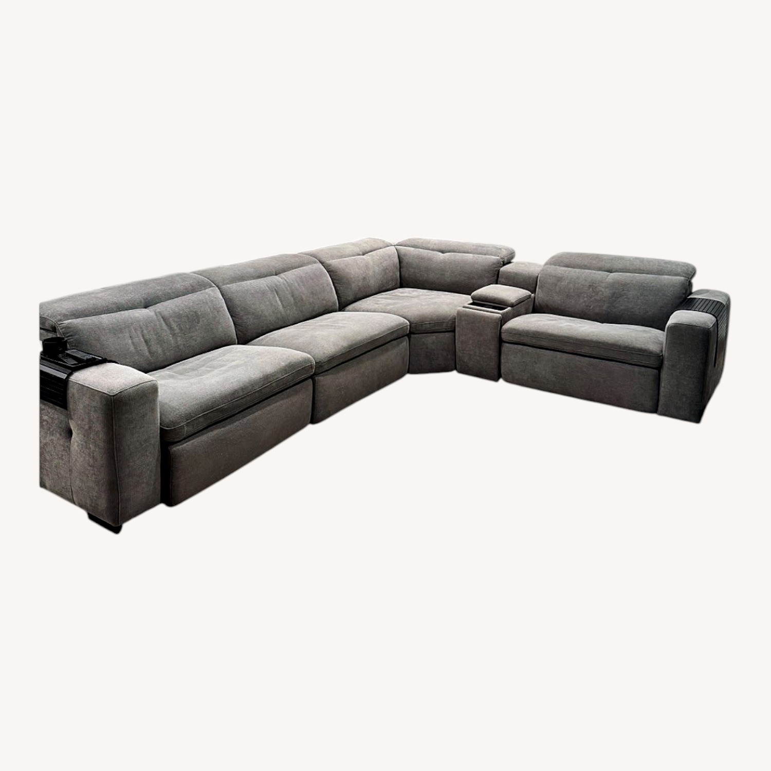 Seller's Notes:Absolutely love this couch!! It is so comfortable, and in great condition! Only had it for a few years but we are moving and it sadly won’t fit in our new space. Purchased 3 years ago from living spaces, we have 2 end seats and one center armless seat which all recline. 1 corner seat which does not recline. There is an arm rest that has storage, charger ports, and 2 cup holders. The cup holder opening does not always stay fully closed.