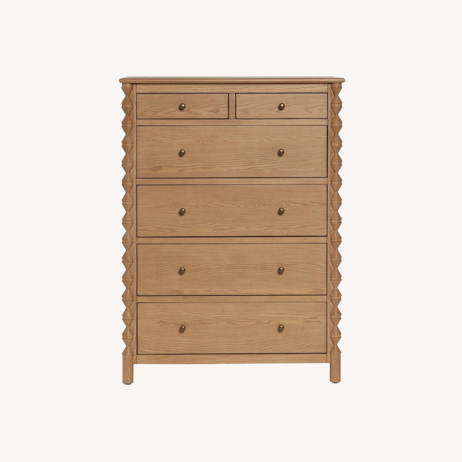 Seller's Notes:This Lulu and Georgia dresser features a natural wood finish with elegant carved side details. It offers six spacious drawers with simple round metal knobs, providing plenty of storage for clothes and essentials. Its clean design and sturdy build make it a stylish and practical addition to any bedroom.