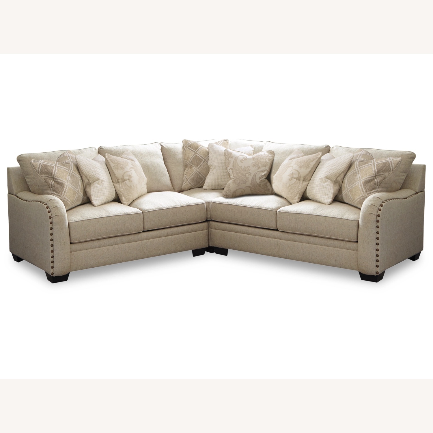 Seller's Notes:Alluring and inviting, the Luxora sectional delivers a combination of traditional style and modern comfort. Upholstered in a soothing bisque-colored fabric, this seating arrangement includes UltraPlush cushions and back pillows for added indulgence. Nailhead trim punctuating the sides of the sectional draws attention to the arms' gracious curves. Six designer pillows in muted neutral hues and contrasting patterns add warmth and texture.