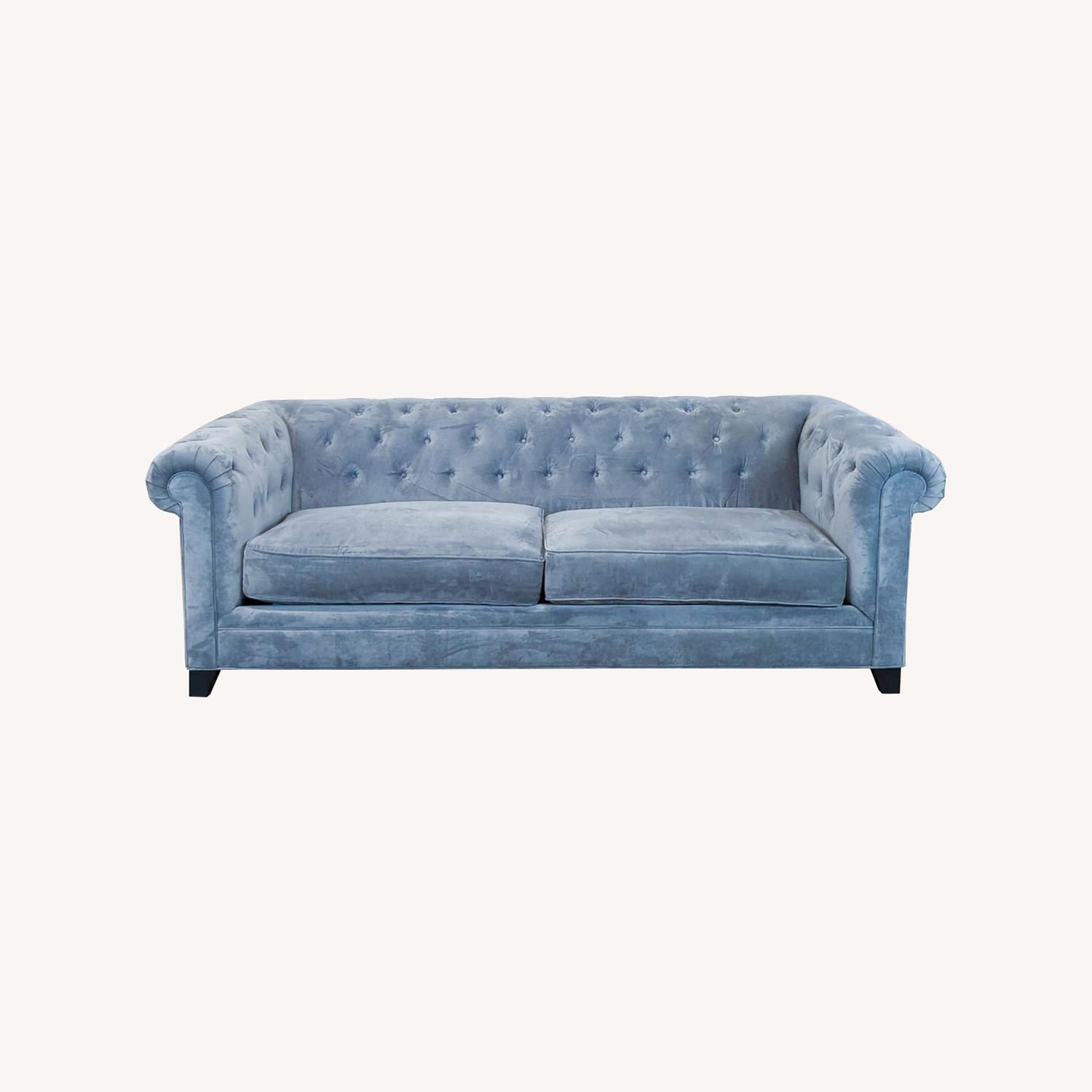 Seller's Notes:This Macy's 3-seat sofa features a classic tufted backrest and rolled arms, covered in soft light blue velvet fabric.