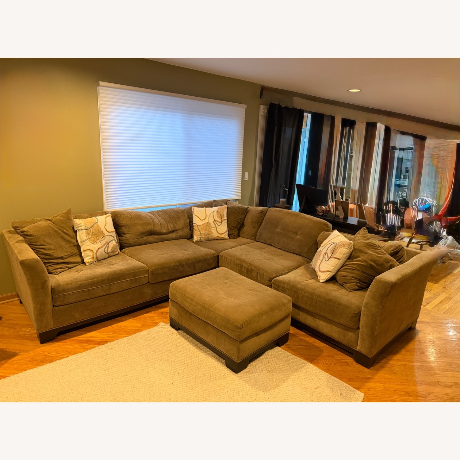 Seller's Notes:Macy’s microfiber sectional sofa with matching ottoman. Plush and comfortable, with high density foam cushions. No rips or tears. There is some discoloration from normal wear, which is reflected in the price. All pillows shown are included. Great for a family room, basement, or casual living space. High-quality construction that’s hard to find at this price. Smoke-free home. Pickup only. $500 Approx. measurements 109” long both directions from corner. 39”deep