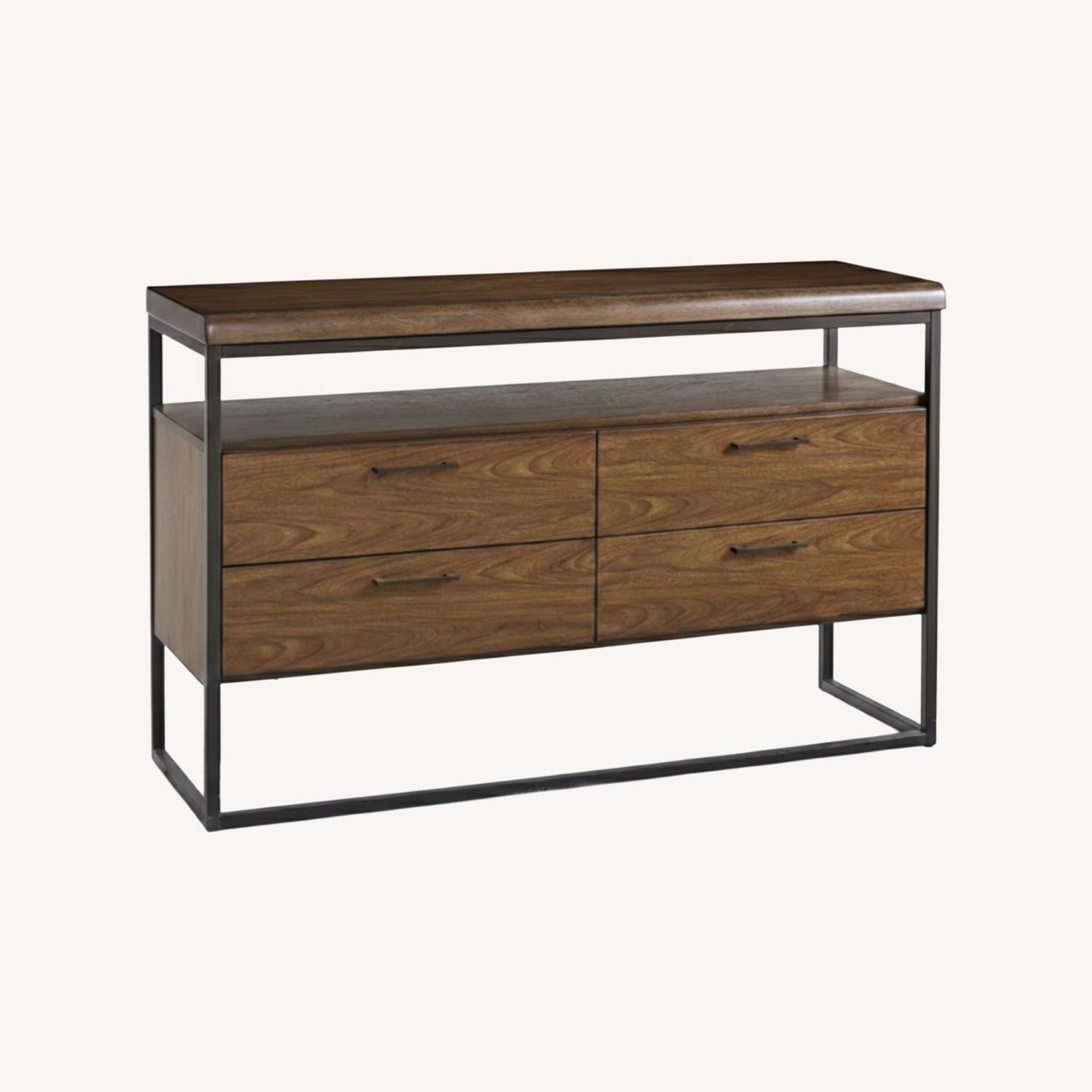 Seller's Notes:Macy’s Everly collection — a beautiful walnut and black metal sideboard with 4 drawers and an open top shelf. Solid, sturdy piece with great storage. Works perfectly as a buffet, media console, entryway table, or living room credenza. In excellent condition.