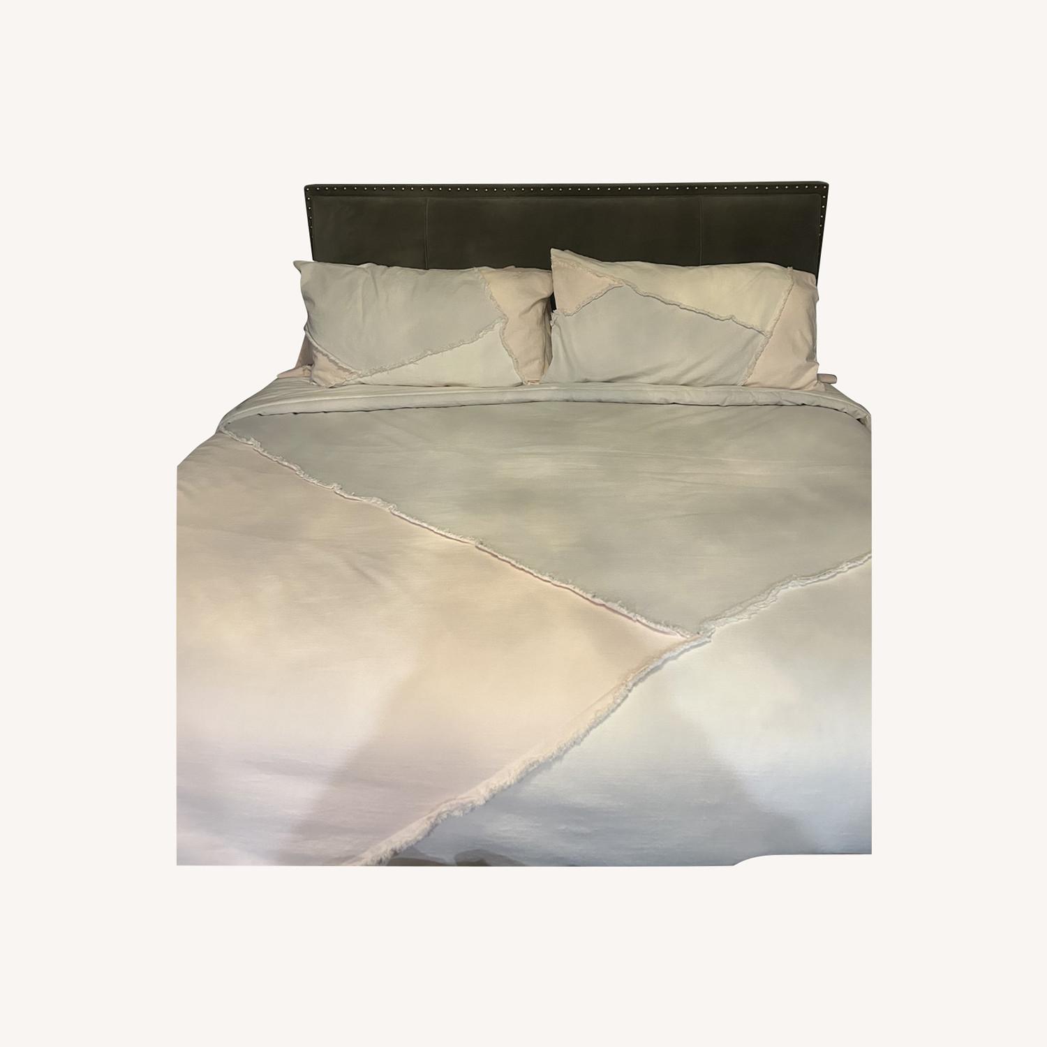 Seller's Notes:Microsuede King bedframe with stud detail outlining headboard with storage bench. In good condition, from pet and smoke free home