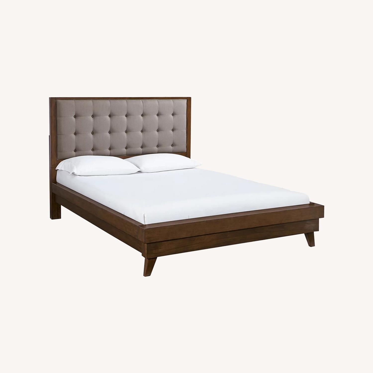 Punctuated by flared legs, the sharp lines of this queen bed are finished in a rich bourbon tone that accentuates the wood grain and complemented by a soft, button-tufted upholstered headboard to offer enticing mid-century modern style.
