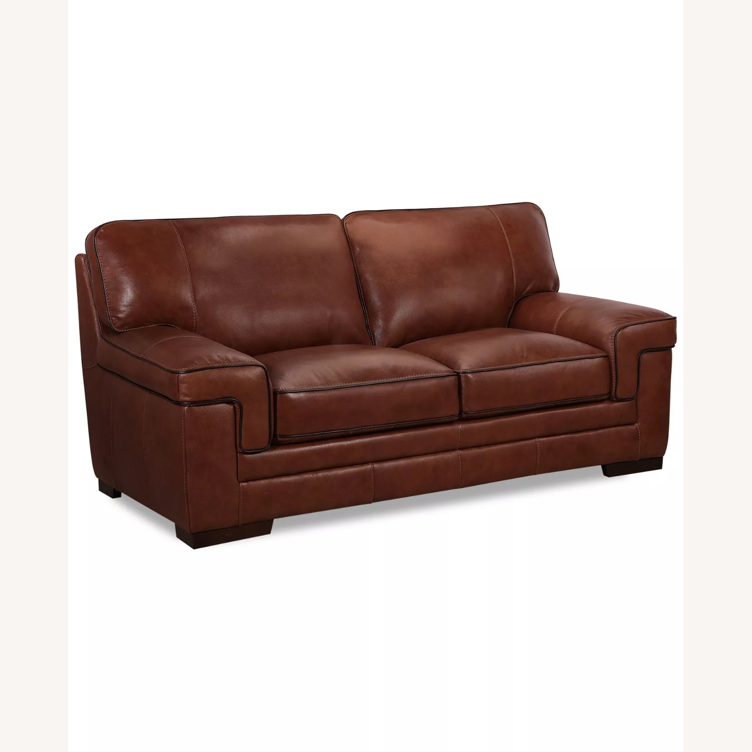 Seller's Notes:Crisp geometric lines combine with plush cushions to deliver this handsome loveseat. Enveloped in buttery smooth leather with contrast piping and stitching, one can marvel not only at its appearance but also relax in its luxurious, comforting embrace.